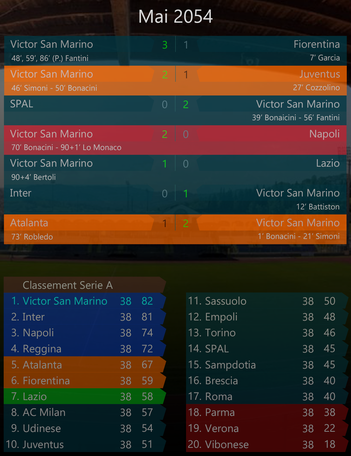 | Possession | Inter (61%) | Juventus (58%) | AC Milan (55%) | Victor San Marino : 4e (55%) |