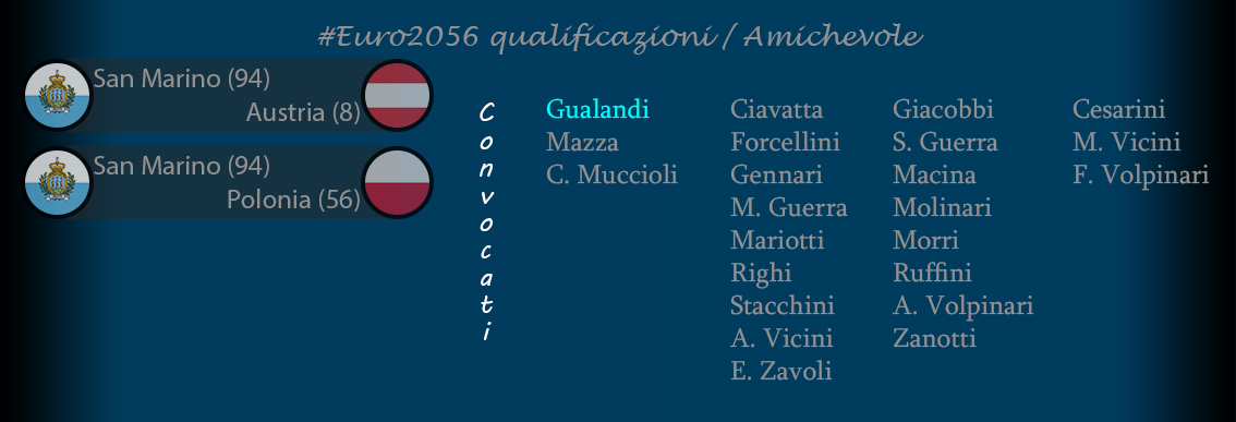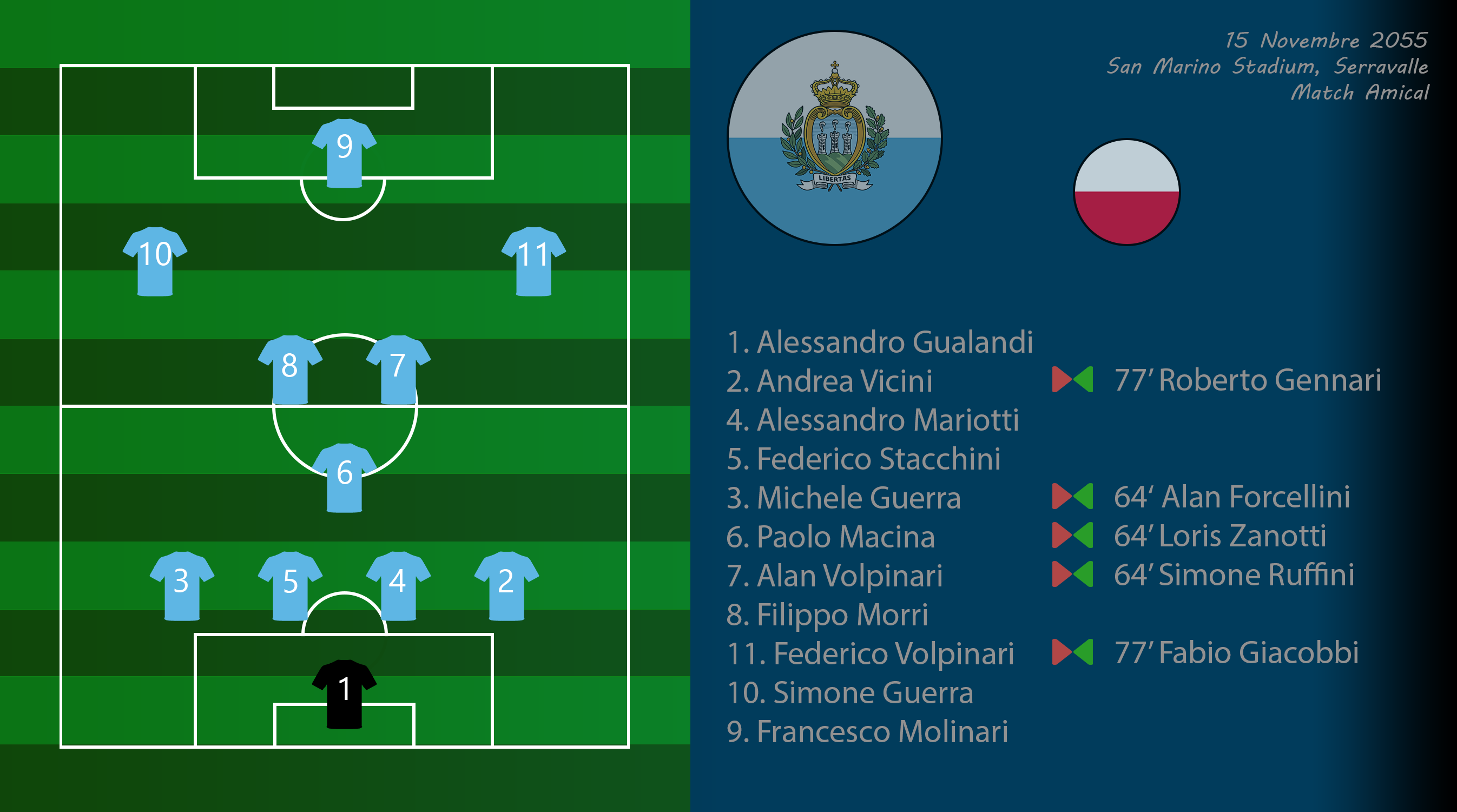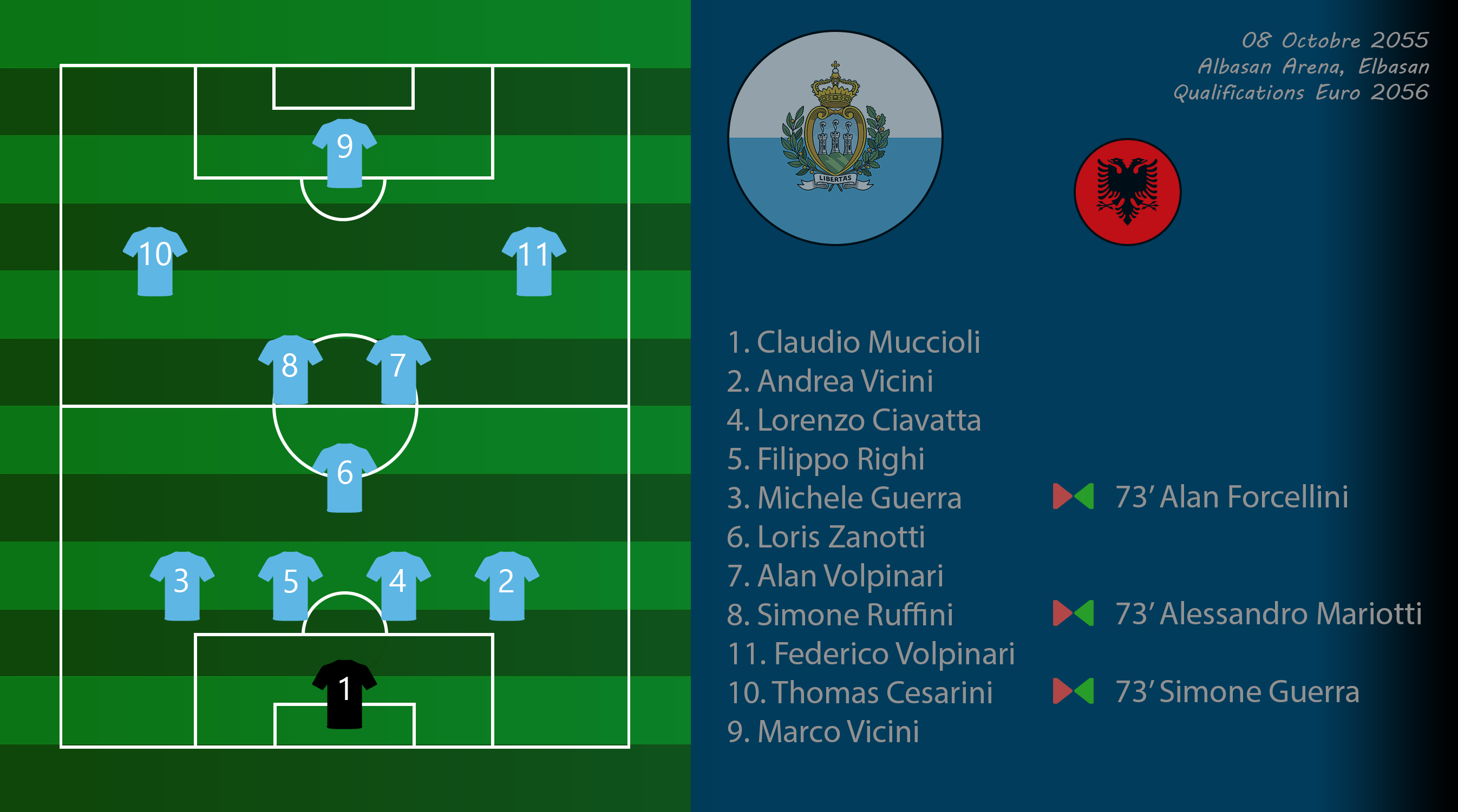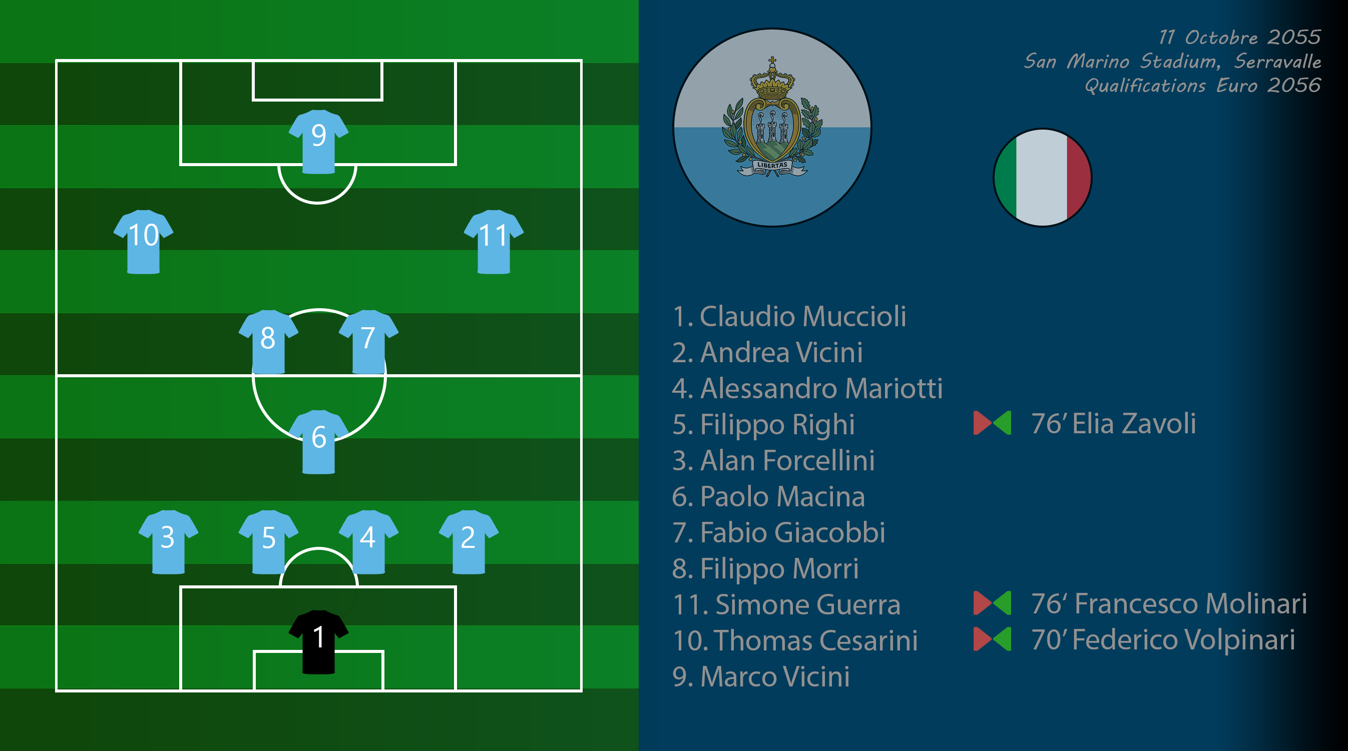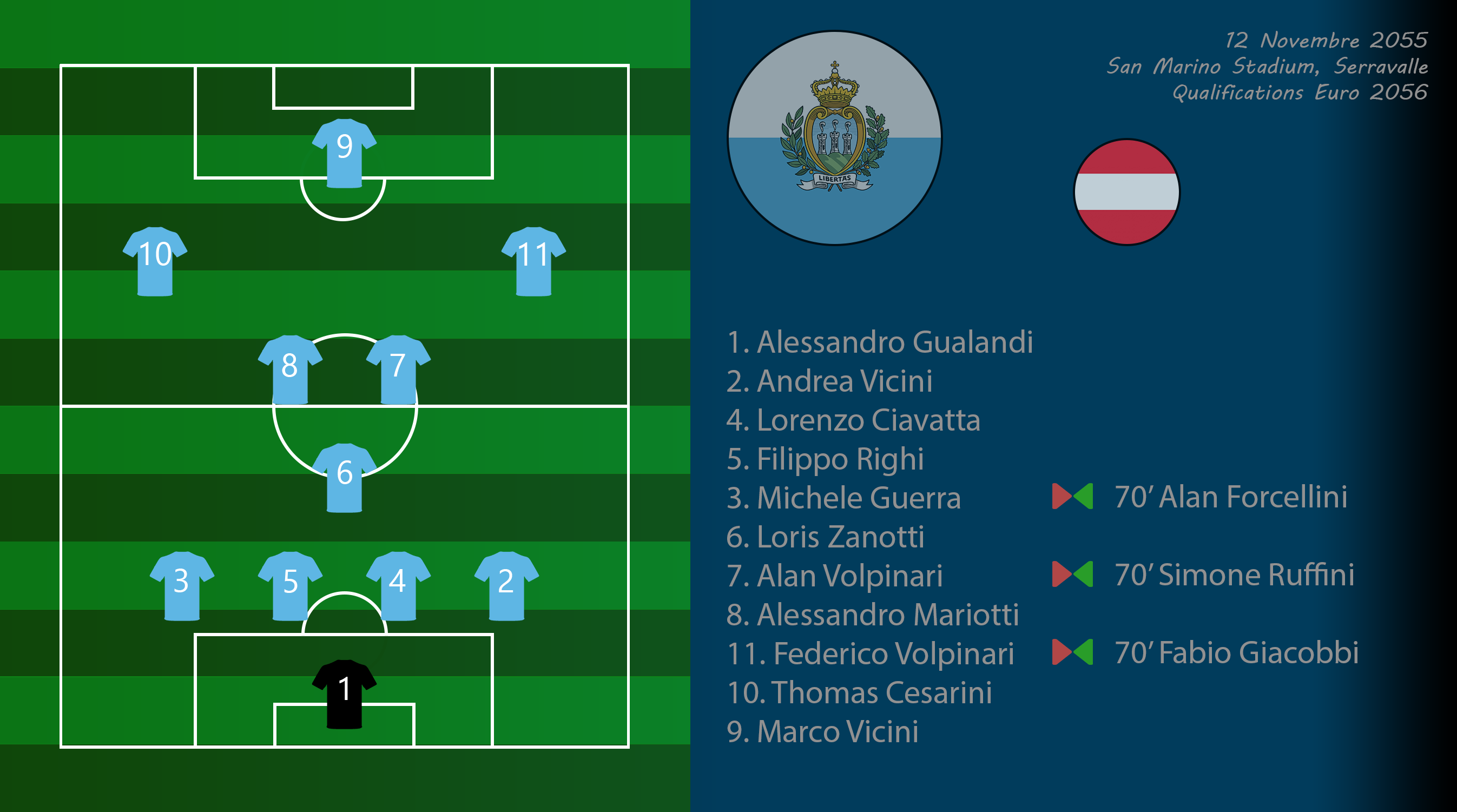 Chemin inverse pour Nicolo Pasolini, qui doit dĂ©clarer forfait. Il est remplacĂ© par Alan Forcellini (27 sĂ©l. U21), qui fĂȘte sa premiĂšre sĂ©lection en Ă©quipe A.