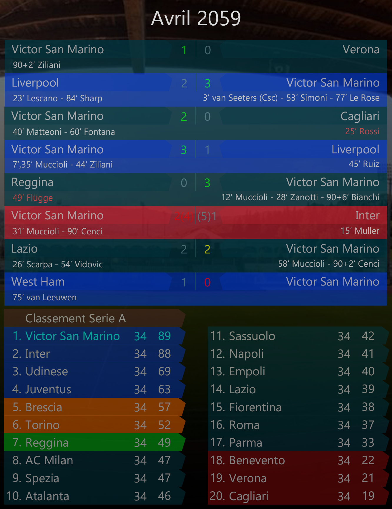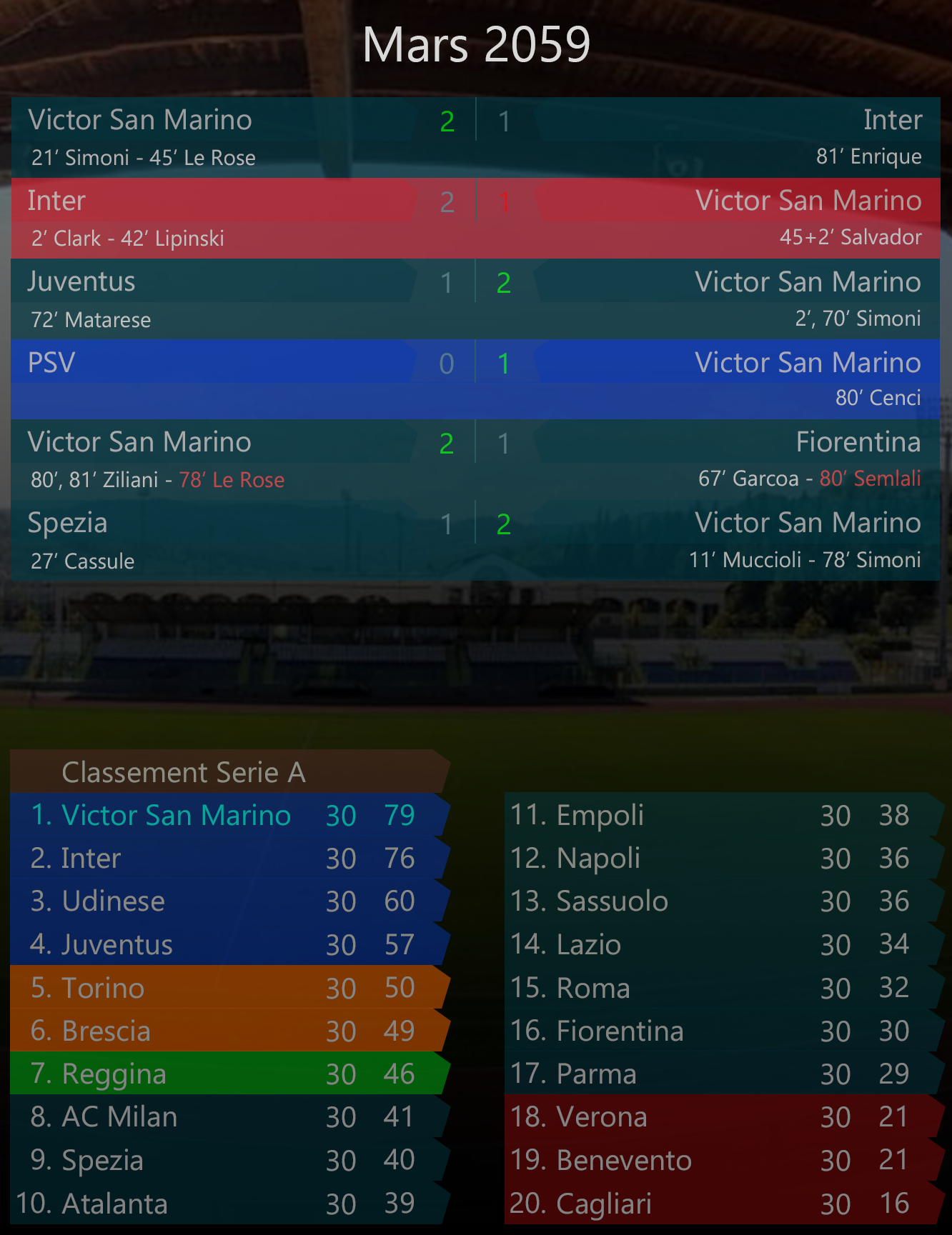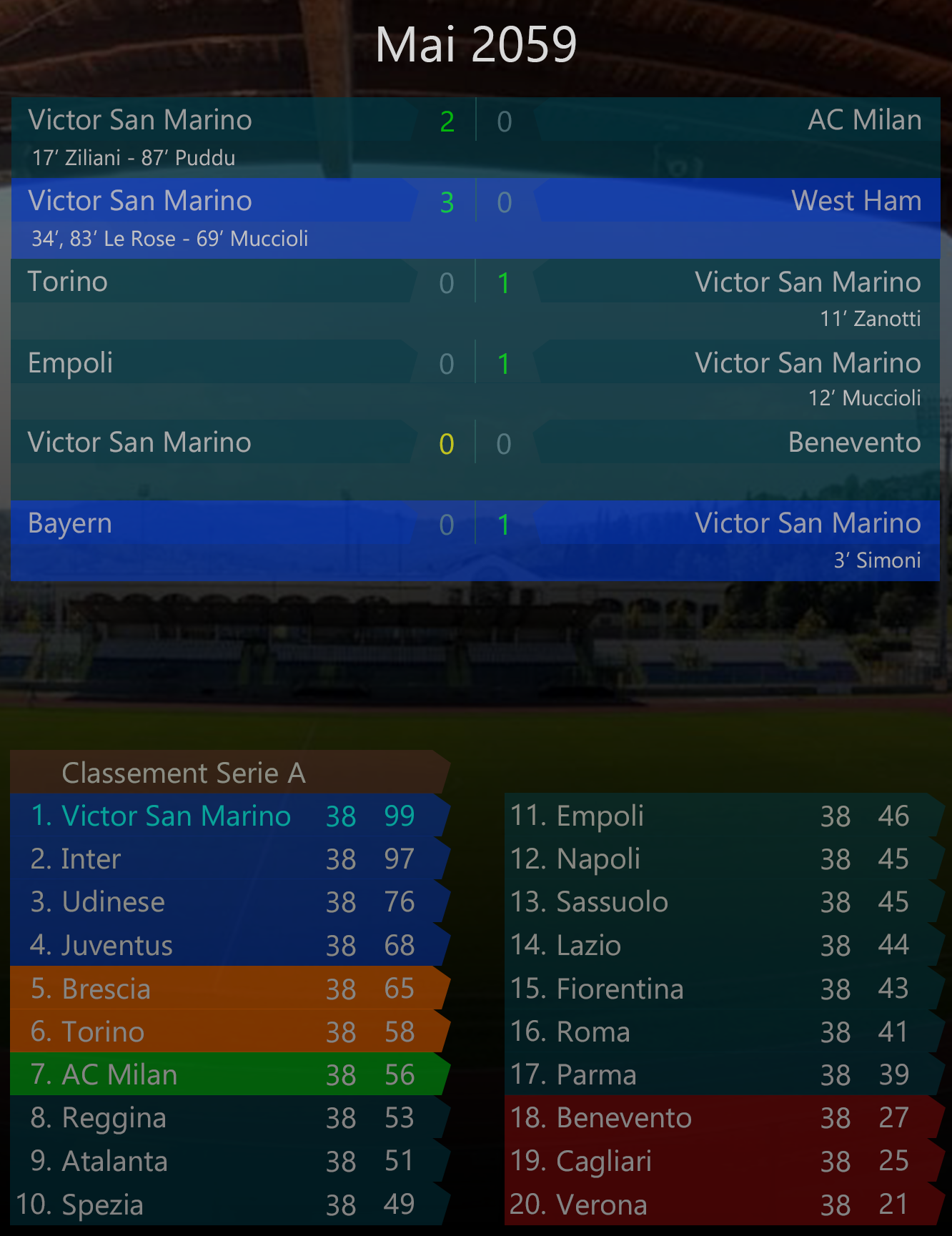 Commençons par le 10/12 en championnat. On garde la tĂȘte pour un petit point et grĂące Ă un but en toute fin de match Ă la Lazio. Il reste 4 matchs Ă disputer et la lutte va ĂȘtre Ăąpre jusquâau bout.