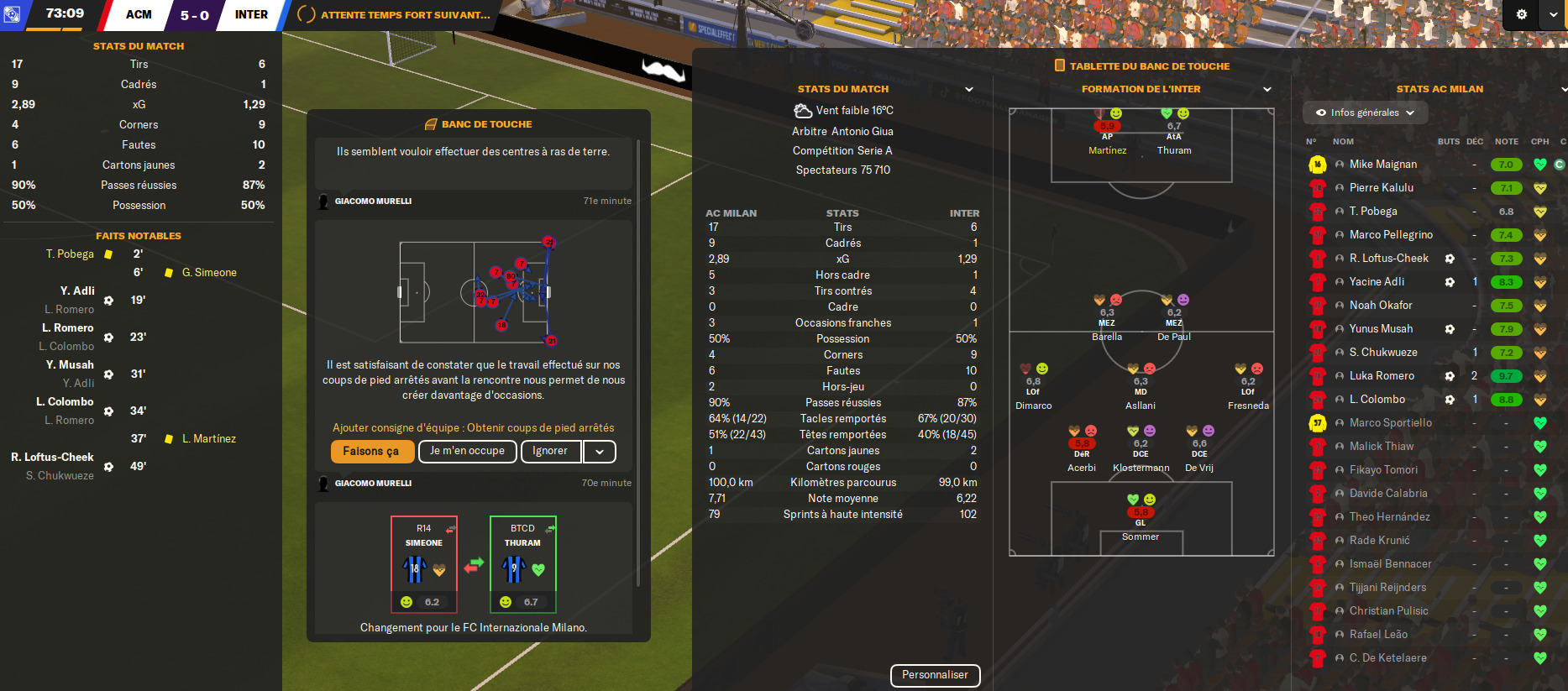 Je suis sceptique. 2ème saison avec Milan. Je joue l’Inter entre les deux matchs de demie de CL. Avec mon équipe bis. J’ai tué le game docteur ? (Le match termine à 6-2, j’ai fait aucun changement)