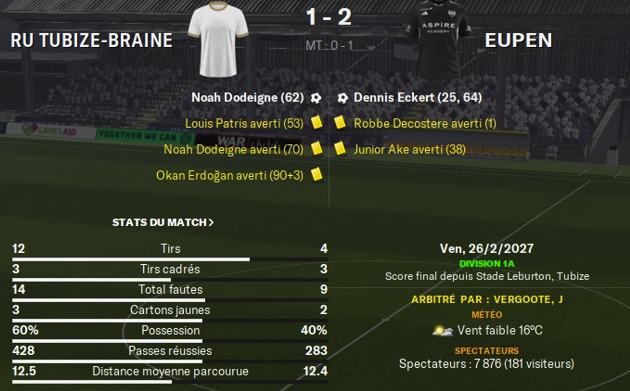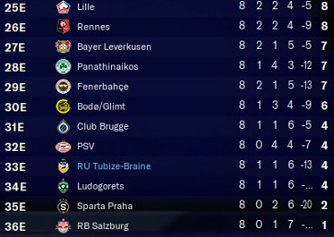 On termine la saison européenne par une défaite cruelle à domicile avec deux buts adverses en fin de match dont un penalty pas évident. Au classement on finit évidemment loin d’une qualification et pas loin du dernier. On aura par contre un peu rempli les caisses du club.