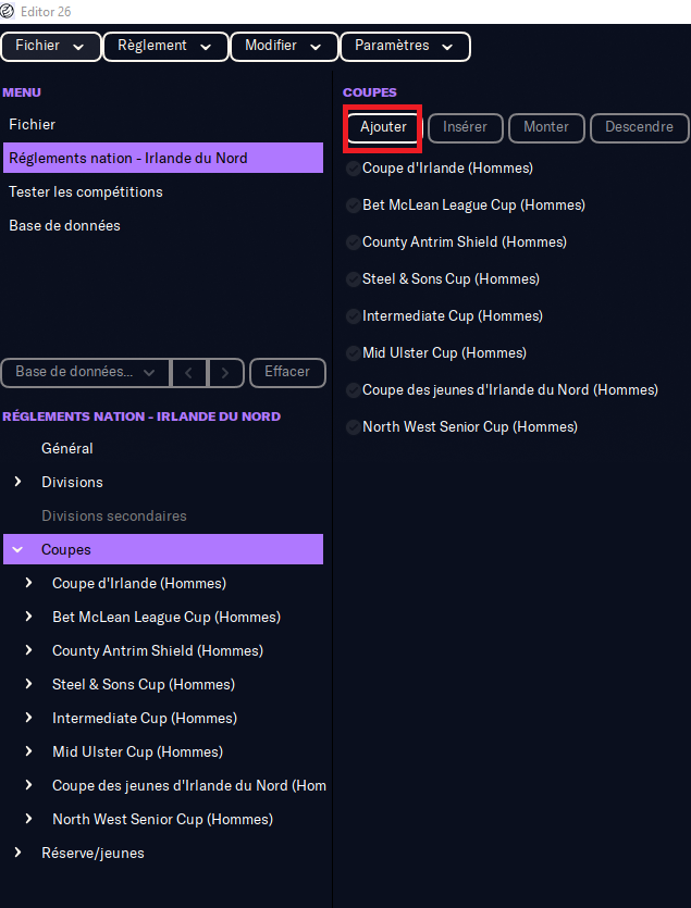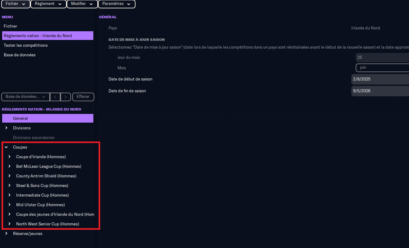 Je veux ajouter la Super Coupe d’Irlande du Nord ( NIFL Charity Cup ) la coupe est dans la base de donnée de FM mais elle est grisé on ne peut pas la jouer dans FM, et je n’arrive pas à la rendre jouable dans l’éditeur. Si un expert de l’éditeur pouvait me donner un coup de main, merci