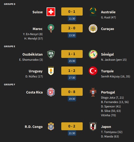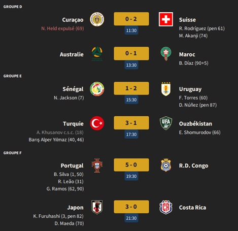 Australie, Uruguay et la R.D. du Congo terminent au 3e rang, c’est terminé pour Curaçao, le Sénégal et le Costa Rica. C’est une surprise de voir l’Ouzbékistan passer en tant que 2e du groupe.