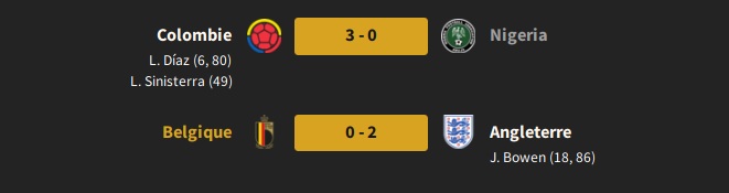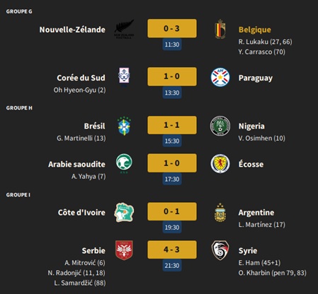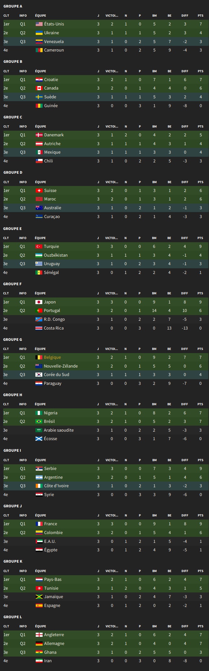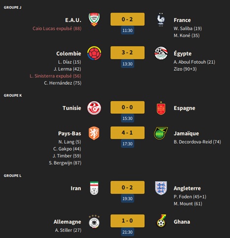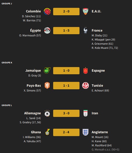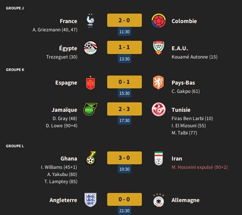France et Colombie dans le Groupe J, Angleterre et Allemagne dans le Groupe L et énorme surprise dans le Groupe K avec l’élimination de l’Espagne, qui est dernière du groupe avec un petit point.