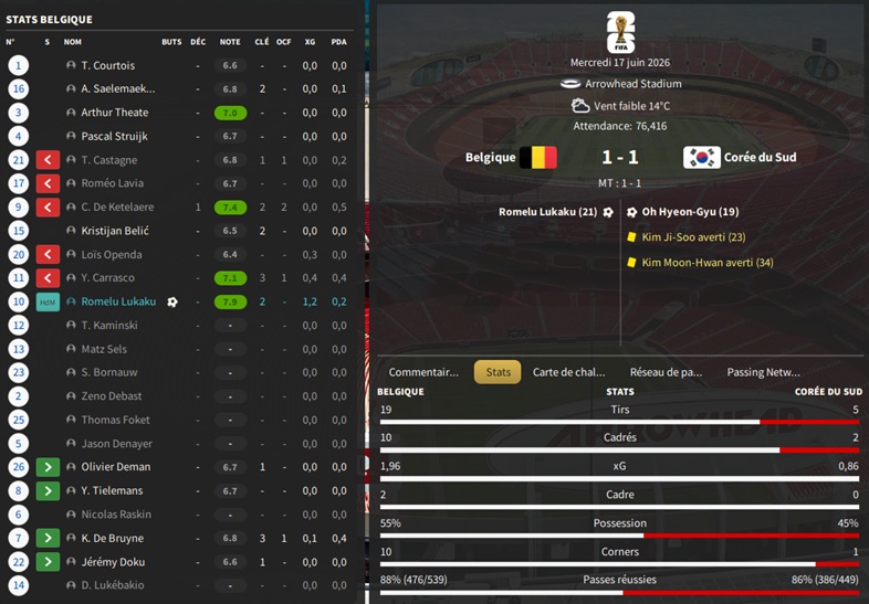 On a récupéré De Bruyne et Doku, ils prennent place sur le banc. Deman a cédé sa place, à gauche, à Castagne. La rencontre se joue toujours à Kansas City, la tactique reste la même également.