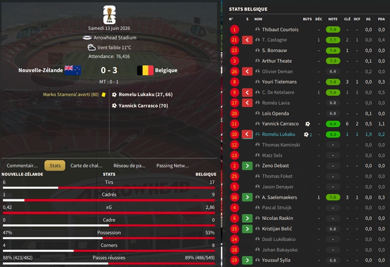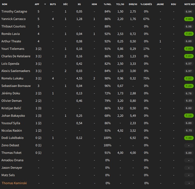 Carrasco et Lukaku ont assurés, De Bruyne était blessé à son arrivée et n’a pas mal joué, quelques bonnes surprises parmi les autres, comme Bornauw, Lavia, De Ketelaere, Bakayoko et Lukébakio. Quatre buteurs et huit passeurs, au moins nous avons des joueurs créatifs.