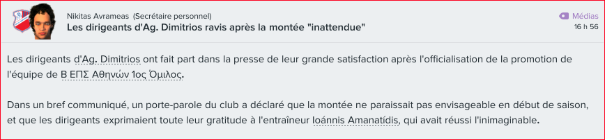 L’attaque est le secteur le plus satisfaisant, il faudra nous battre pour conserver nos joueurs, mais sauf départ, seul un milieu offensif excentré supplémentaire, et un buteur devraient nous rejoindre. Je fais confiance à notre trio Theodorou, Ntaifotis, Dalianis pour s’adapter au niveau supérieur.