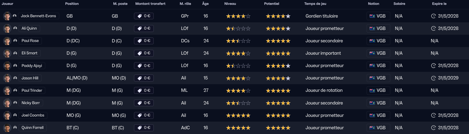 L’effectif justement. Il est temps d’y venir. Et il faut dire que j’ai peu de joueurs et un effectif foutrement jeune.