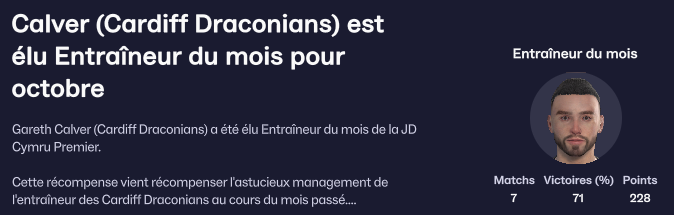 DĂ©jĂ Ă©lu entraineur du mois dâaout, Gareth remet ça en octobre.