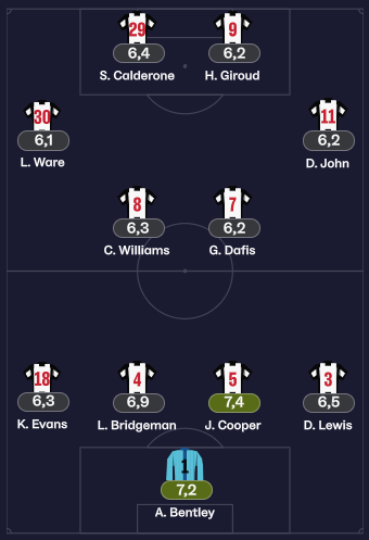 Doublé pour GIROUD, DAFIS et COX marquent également et BENTLEY est solide dans les buts.