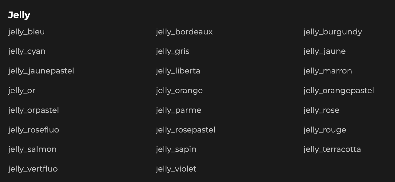 Les possibilités sont liés aux balises jelly et aux menus jelly. La plupart des couleurs disponibles dans ces deux options le sont aussi ici. L’objectif est de pouvoir facilement combiner tout ça pour personnaliser vos récits.