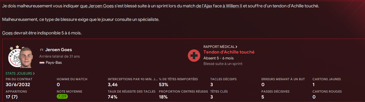 On a pas le droit de se faire sortir comme ça en dominant tout le match, 36 tirs pour 18 cadrés contre 1 tir 0 cadré pour eux. On perd bêtement aux tirs aux buts, je ne suis pas content. En plus de ça mon latéral gauche se pète le tendon d’Achille et d’après le doc il en a pour 6 mois, fin de saison pour lui.