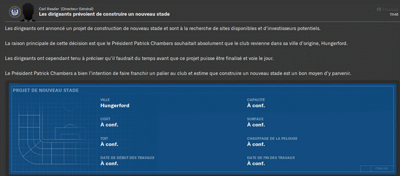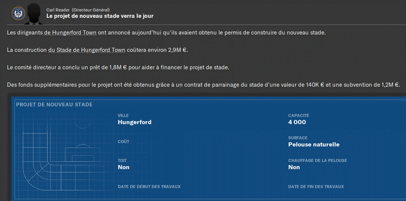 Le Président anticipe déjà la montée en puissance du club et entrevoit un projet de construction de nouveau stade au sein de notre ville d’Hungerford Town. Reste à éclaircir ce projet en le dimensionnant aux normes exigées par la fédération anglaise tout en prenant compte notre capacité d’accueil de nos supporteurs pas encore très nombreux à l’heure actuelle.