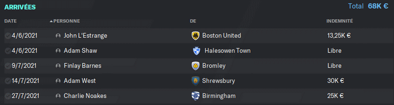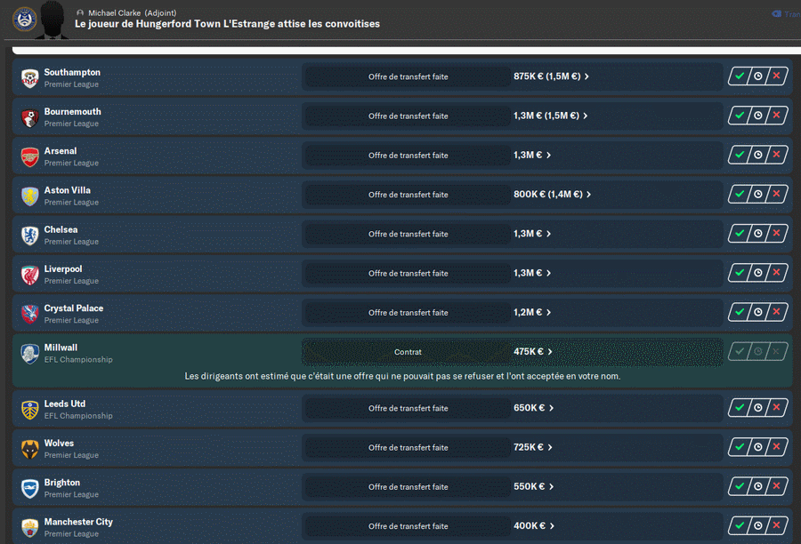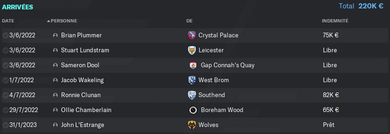 Comme prévu, mon président qui a accepté une offre sans mon accord pour Hill, m’autorise à lui trouver un remplaçant et donc un joueur supplémentaire. Nous avons réussi à obtenir le prêt de L’Estrange jusqu’à la fin de la saison, ce qui nous évite de compenser dans la précipitation son départ.