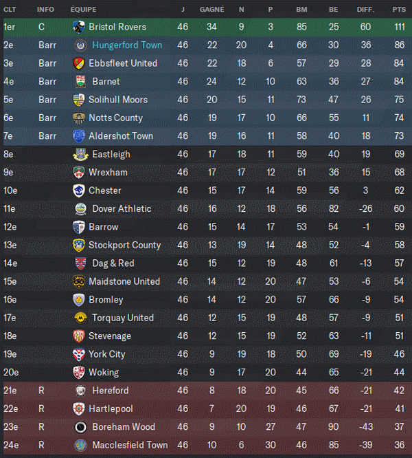 Nous avions terminé ce championnat, là aussi comme la saison dernière, à la seconde position. Mais à la différence de notre précédente année, le champion Bristol Rovers était largement au dessus du lot et mérite sa première place. Nous avons quasiment passé l’ensemble du championnat à cette deuxième place et tandis que l’écart avec le premier s’agrandissait, nos poursuivants nous ont rattrapé sur la fin à la faveur de beaucoup de matchs nuls concédés pour notre équipe.