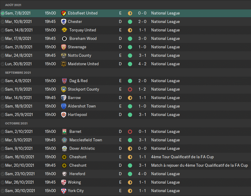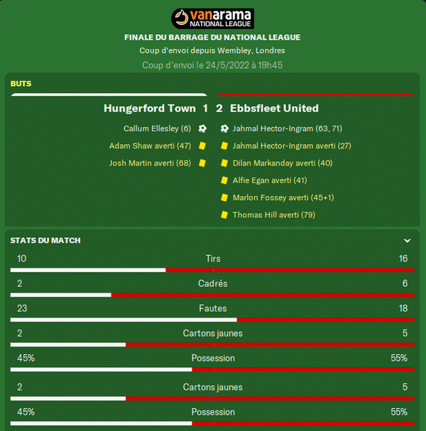 Nous échouons comme la saison passée en finale des barrages cette fois contre Ebbsfleet au terme d’un match dans lequel nous avons mené rapidement mais nous avons trop défendu ce score pour nous faire rattraper et dépasser en seconde période. Cette défaite est frustrante mais pas illogique sur l’ensemble de la rencontre.