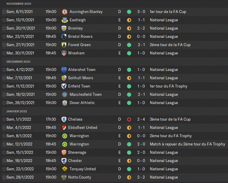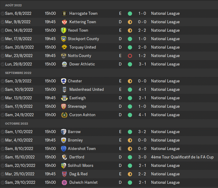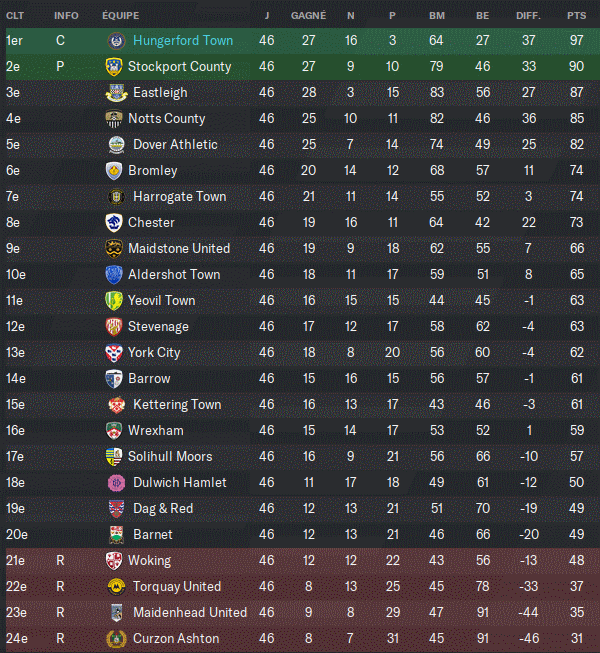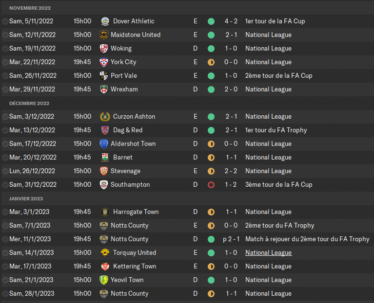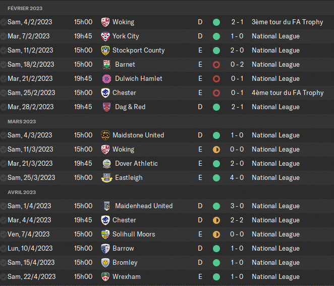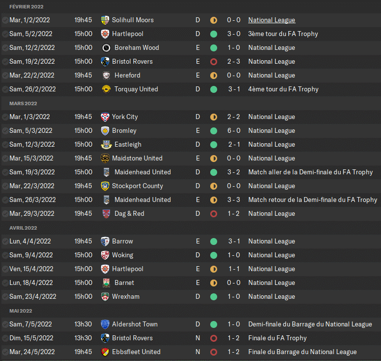 Après deux secondes places consécutives, cette fois nous ne laissons pas échappés le titre et nous terminons champion de la National League ! Nous avons fait la course en tête tout au long de la saison et malgré une série de matchs difficile en février, nos adversaires étaient trop loin pour nous rattraper. Nous avons su également nous montrer impériaux face à nos concurrents directs et notamment Stockport (11 février) et Eastleigh (25 mars).