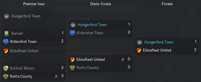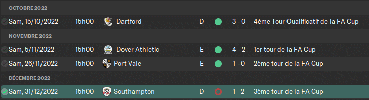 Comme la saison dernière, nous atteignons les 32ème de finale de la Cup avec cette fois-ci, Southampton, club de l’élite, comme bourreau logique. Nous avions auparavant éliminé deux équipes à notre portée, Dartford (D6) et Dover (D5) mais nous avons surtout réalisé un bel exploit en venant à bout sur leur terrain de Port Vale (D4), club de la division supérieure à la notre.