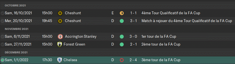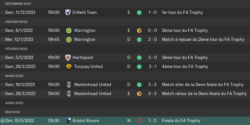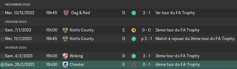 Nous échouons en quart de finale du Trophée FA après une défaite logique face à Chester (D5). Cette défaite fut finalement un mal pour bien puisque cela nous aura permis de nous concentrer exclusivement sur le championnat en fin de saison.