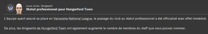 Une formation pour un nouveau diplôme vient tout juste d’être entamé pour continuer à progresser. Je suis comme les saisons passées, reconnu par mes paires en championnat avec la distinction d’entraîneur de l’année. Mon contrat fut revalorisé à la hausse avec un contrat plus long et une clause automatique d’augmentation en cas de montée.
