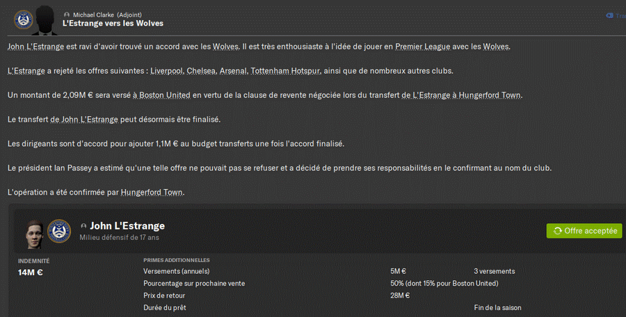 Alors que nous étions plutôt tranquilles au mercato estival avec la signature de son premier contrat professionnel, L’Estrange a logiquement attiré tous les regards de nombreux recruteurs anglais et notamment des meilleurs clubs de l"élite. Après toute un mois de négociations acharnées avec différents clubs, les Wolves ont dégainé une offre qui ne peut se refuser ! Même si le président a accepté sans demander l’avis à l’entraîneur, nous avons tout de même bien négocier ce départ avec diverses clauses très intéressantes.