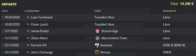 Quelques joueurs sont déjà programmés pour nous quitter puisqu’ils sont en fin de contrat. Berry-Hargreaves, Bailey, McGrory et l’ancien Jones devraient ainsi trouver un autre club pour la saison prochaine. L’Estrange étant aussi un départ acté puisqu’il évoluera désormais avec les Wolves.