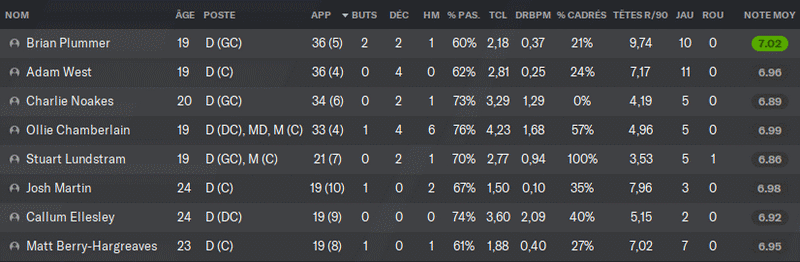 Le duo de centraux, Plummer - West s’est très bien comporté tout au long de la saison. Leur jeunesse et leur marge de progression sont de bonnes augures pour le club. A gauche, Noakes fut un peu décevant mais Lundstram n’a pas réussi à s’imposer non plus. En revanche à droite, l’arrivée précipitée de Chamberlain (suite au départ de Carrick) ne l’a pas perturbé pour s’imposer au fil de la saison. Ellesley a perdu sa place logiquement mais reste un bon complément.