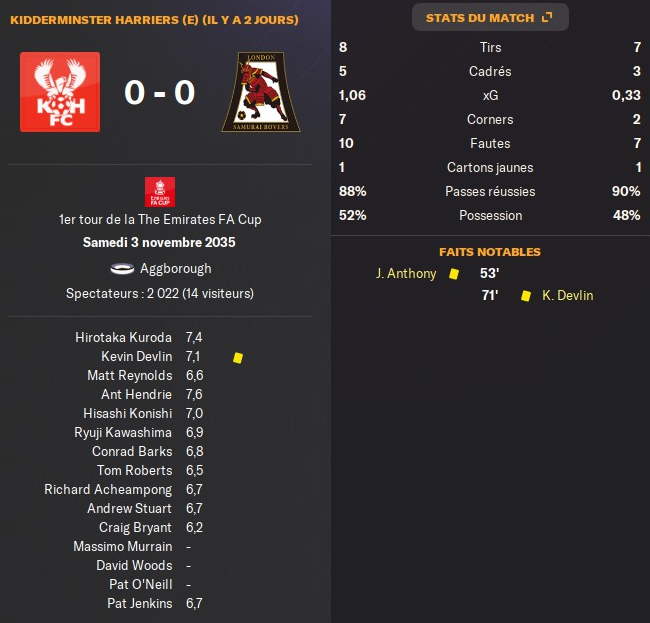 Solihull Moors Match pauvre en attaque pour notre Ă©quipe (5 tirs 1cadrĂ©). lâĂ©quipe nâa rĂ©ussi Ă profiter du match aprĂšs avoir pris un but dĂšs la 1ere minute