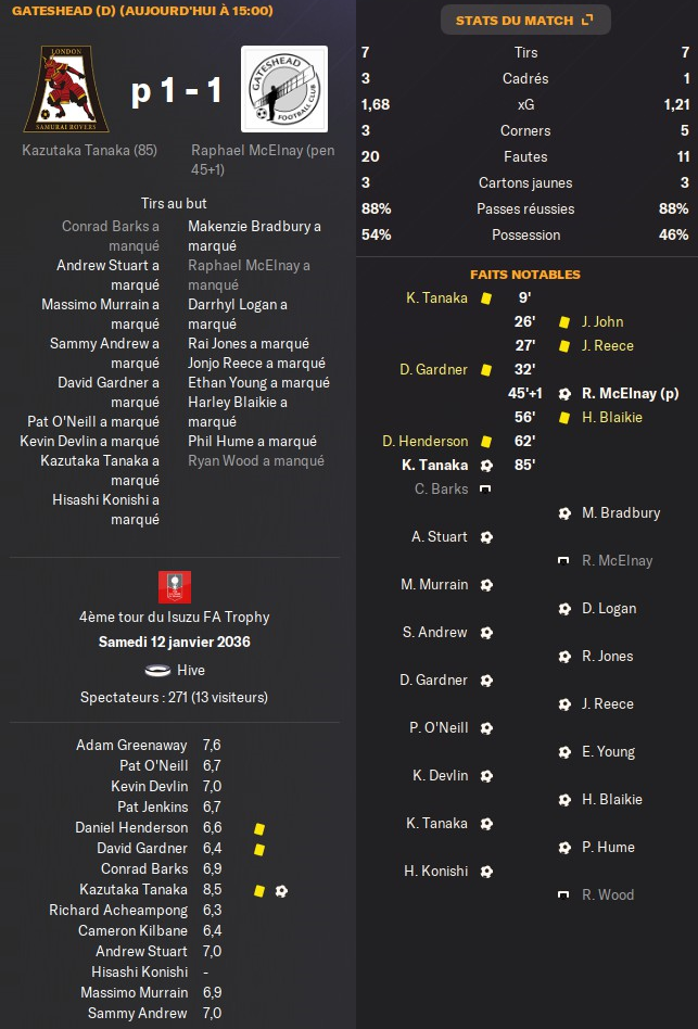 Beaucoup de blessĂ©s et aussi beaucoup de gĂąchis en attaque . Le match se terminera en PĂ©nalty quâon remportera