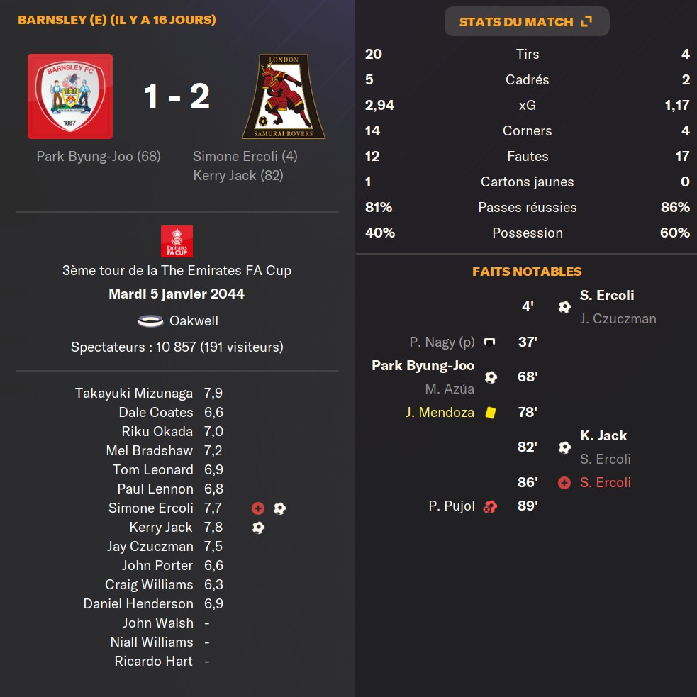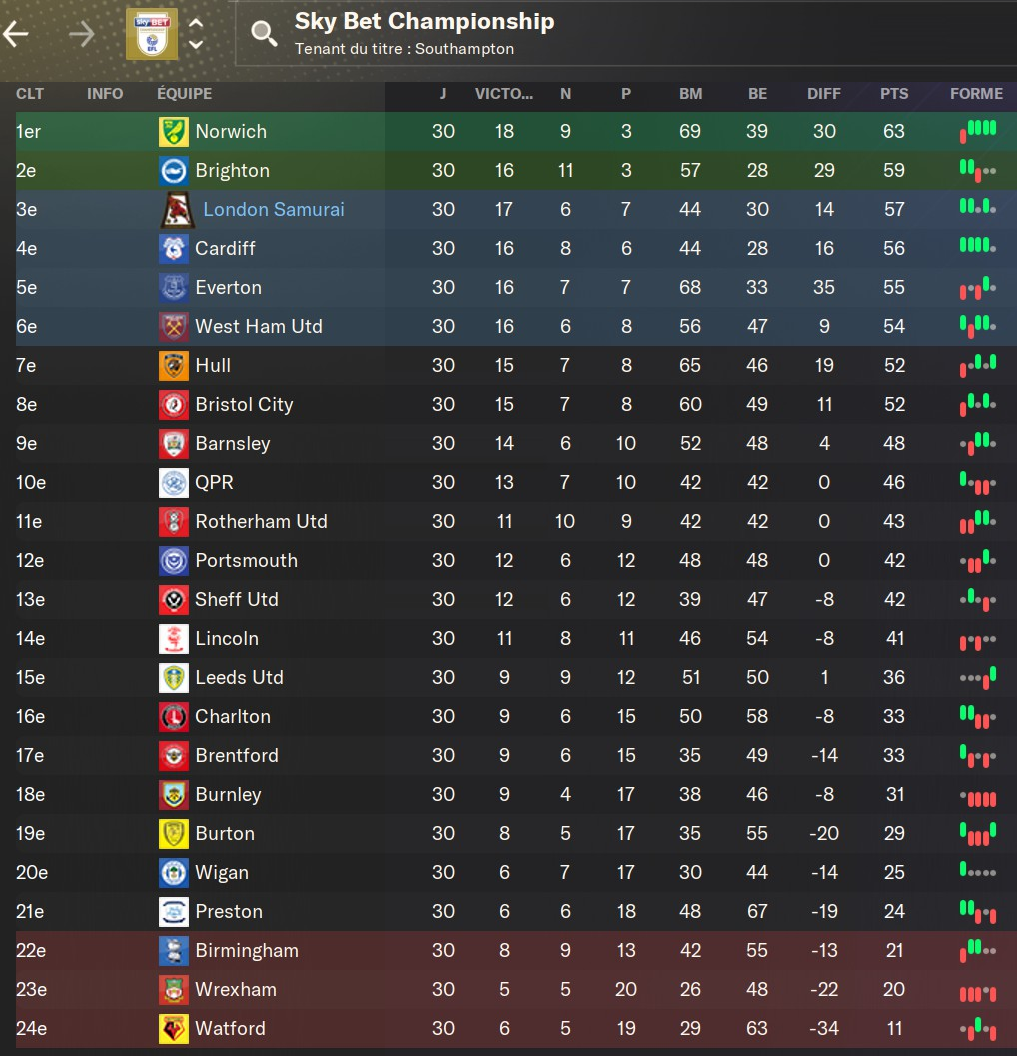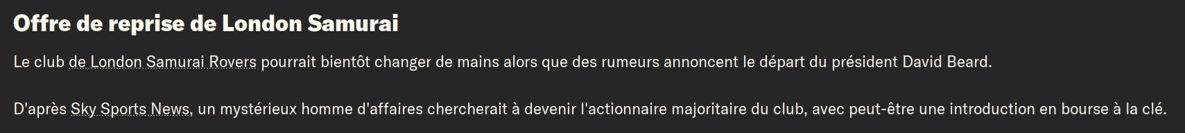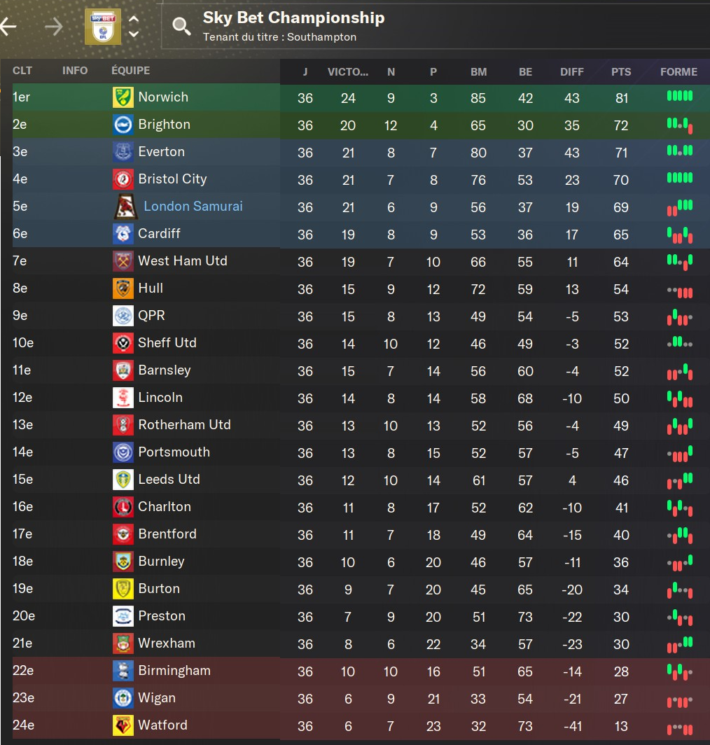 Assez fou dâĂȘtre arrivĂ© en Championship (et mĂȘme dây briller) en Ă©tant parti de si loin, chapeau pour le nombre de saisons, les Samurai ne sont plus le petit poucet de Londres vivement la PL !