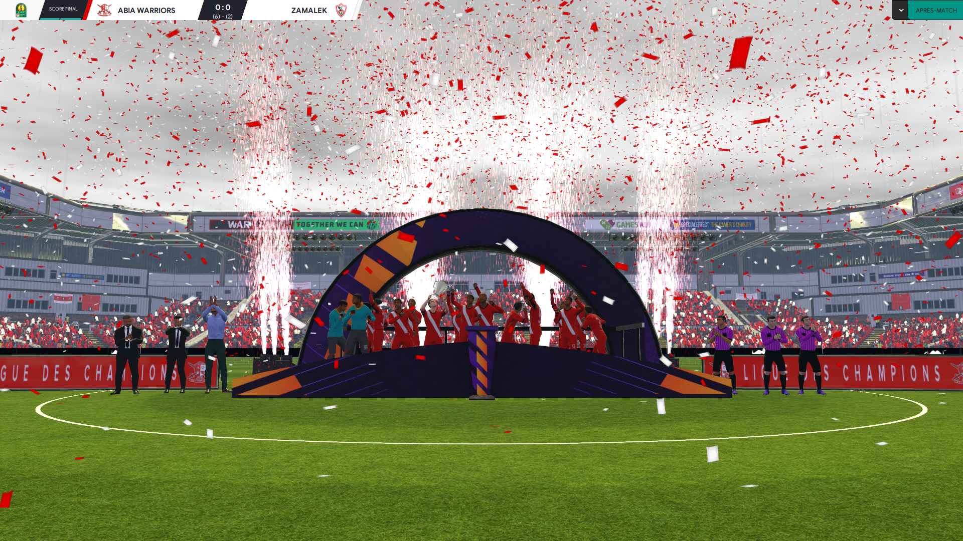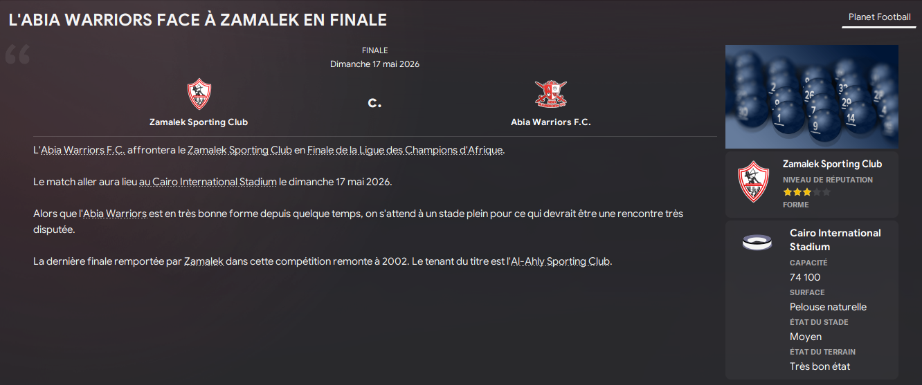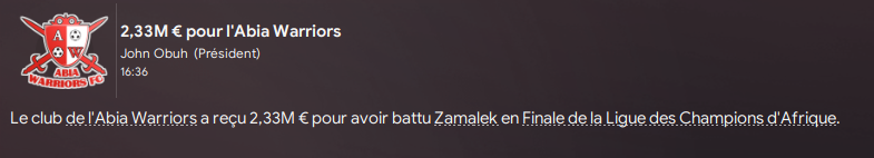 Et câest lĂ que ça se corse⊠le Zamalek est la meilleure Ă©quipe dâAfrique dans le jeu, avec des joueurs niveau Ligue 1 et plusieurs salaires Ă +100k p/m câest clairement un autre monde que celui ou Joseph de Maximy a du vendre un rein pour recruter Ayoub Ayed