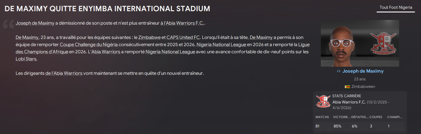Jâavais signĂ© pour une saison et demi Ă Abia Warriors, ce dĂ©lai mâa suffit pour rĂ©aliser tous mes objectifs au Nigeria et en Afrique. On va maintenant se mettre Ă la recherche dâun nouveau projet !