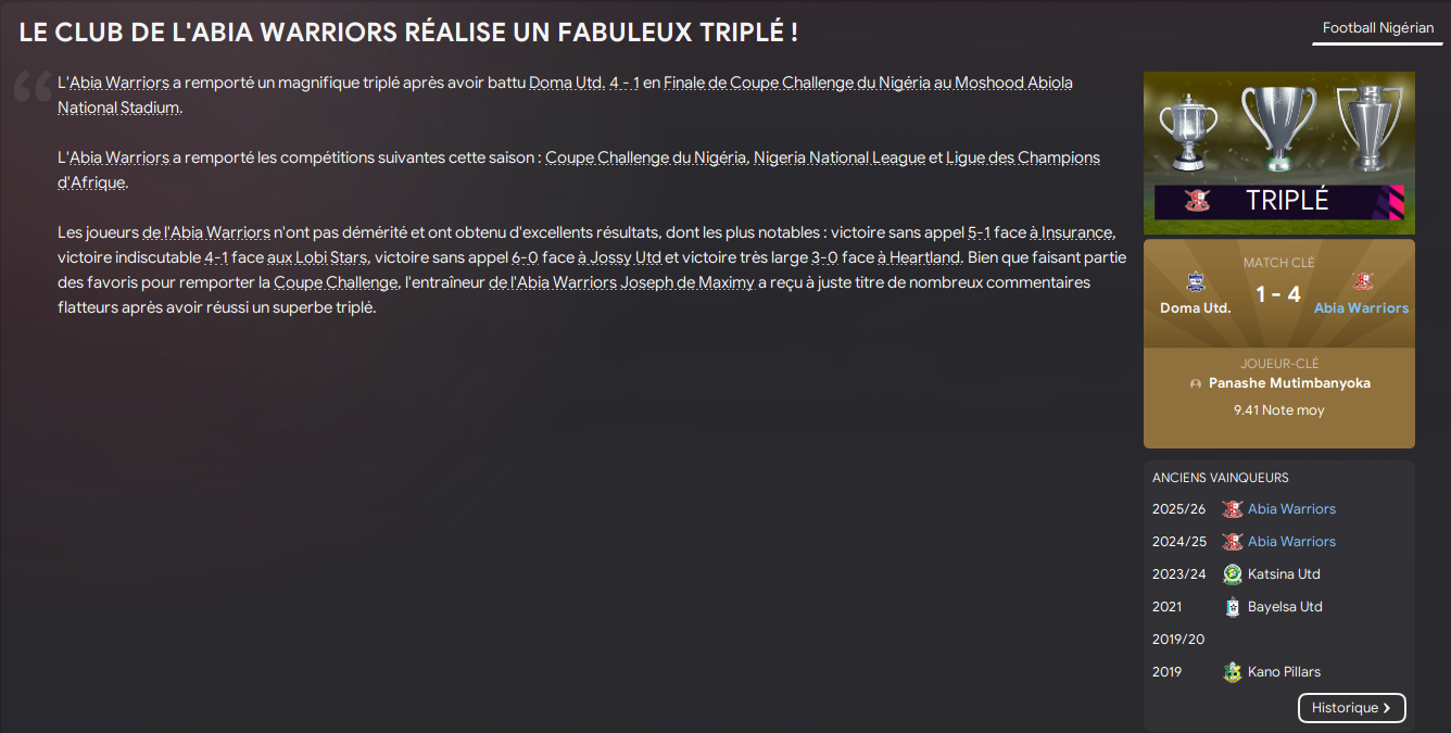 La coupe a Ă©tĂ© un long fleuve tranquille, aucune Ă©quipe ne nous a accrochĂ© et on rĂ©alise le doublĂ© sans problĂšme. DĂ©jĂ notre troisiĂšme titre en un an et demi Ă la tĂȘte dâAbia Warriors !