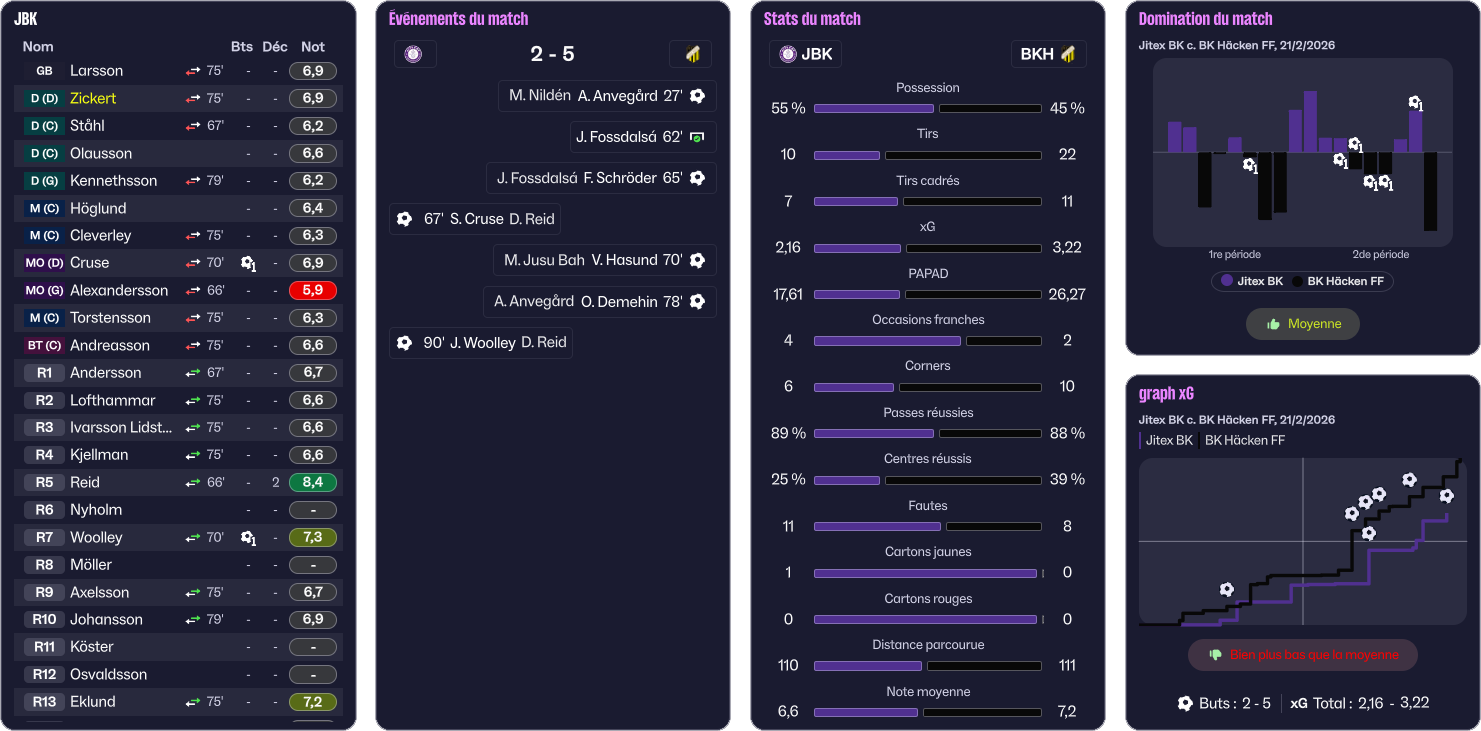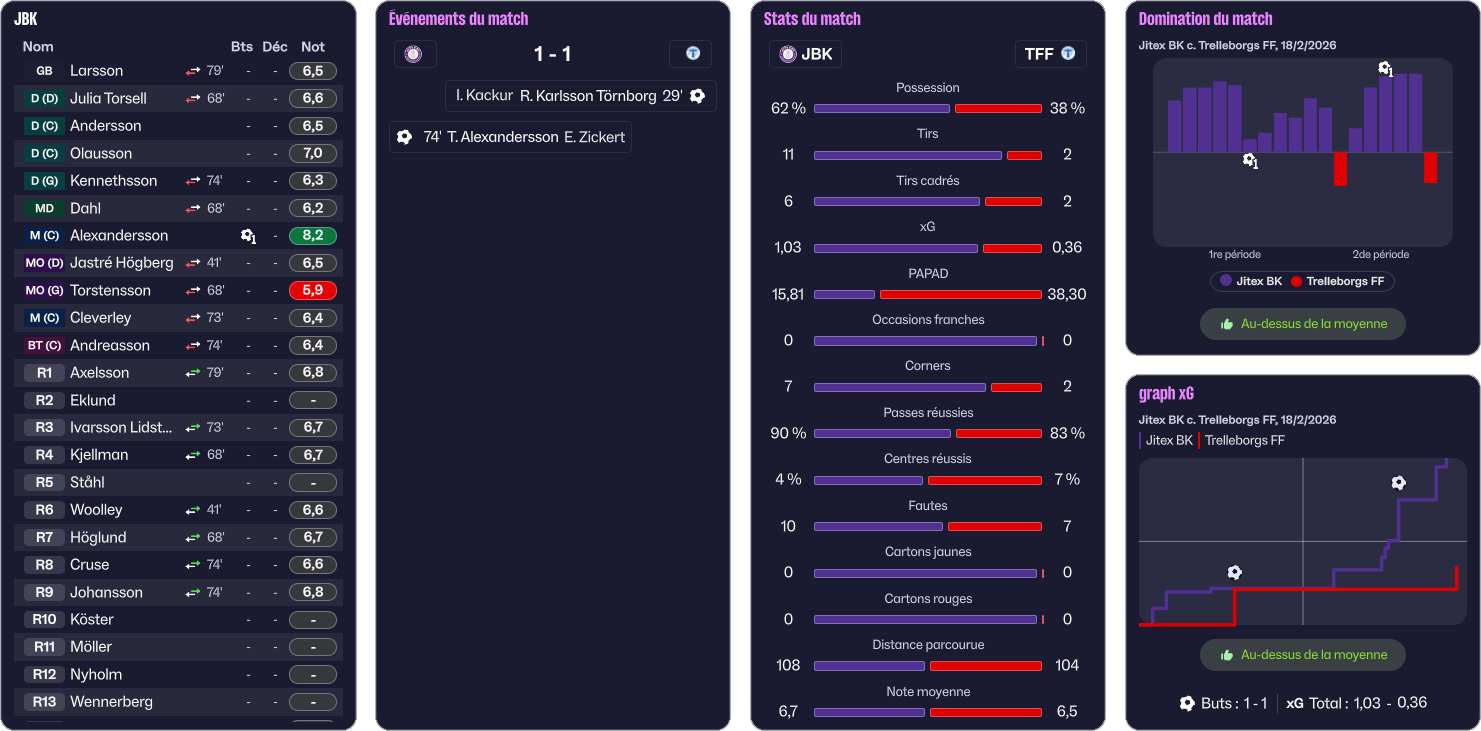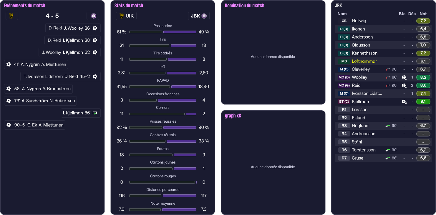 On lĂšve un peu le pied et on encaisse un but en contre (1-3, 41â). Devant lâabsence de rĂ©action de mes joueuses, jâĂ©lĂšve le ton depuis mon banc. Dans les arrĂȘts de jeu, Tindra Ivarsson Lidström rĂ©cupĂšre la balle et lance Destiny Reid sur son flanc gauche. La jeune anglaise repique plein centre et tente une frappe qui est repoussĂ©e par une dĂ©fenseuse. Destiny reprend la balle, dribble la dĂ©fenseuse et frappe fort sur la gardienne. La balle, bien que dĂ©viĂ©e trouve le fond des filets (1-4, 45+2â).