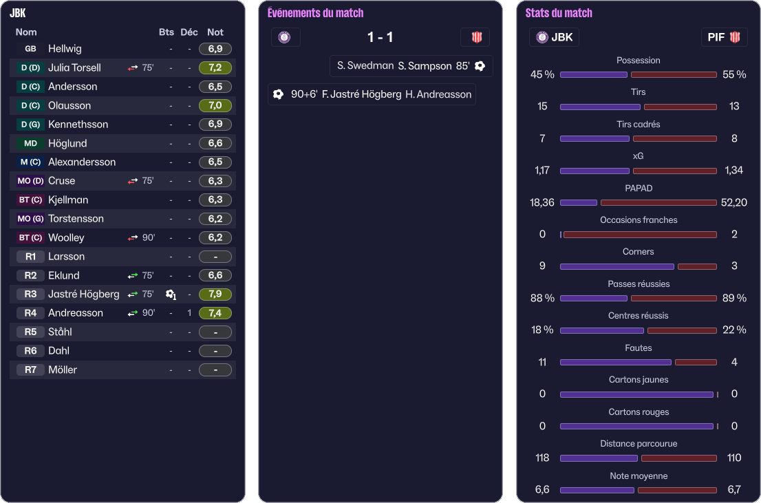 Ida Kjellman, du haut de ses 20 ans, a fait parler la poudre avec ce triplĂ©, son premier et pas le dernier jâespĂšre. Elle mĂ©rite grandement son titre de joueuse du match. Autre grande satisfaction pour moi, Destiny Ried qui sâoffre un but et deux passes dĂ©cisives. En une rencontre, elle a presque rĂ©ussi Ă faire oublier CĂ©lia Aggoune. Jesse Woolley, sâoffre un but et une passe, ce nâest pas si mal que ça pour un dĂ©but.