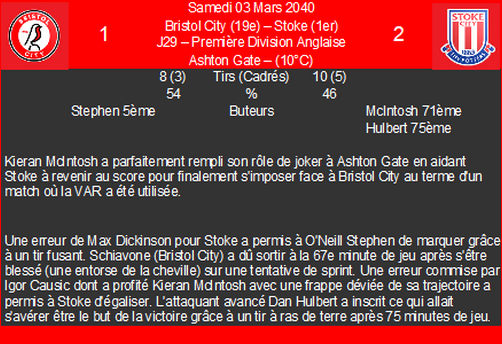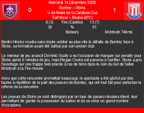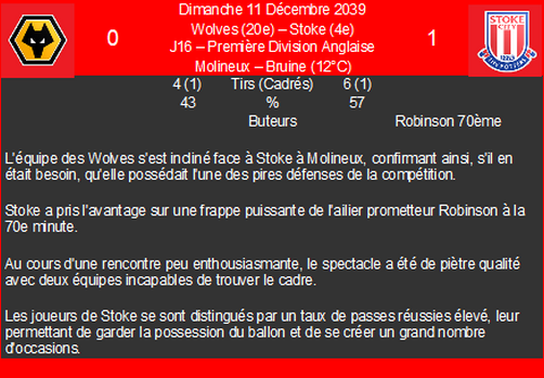 | 18/03/40 | c.hickson | 1/3 jours | contracture Ă la cuisse | blessĂ© lors dâun tacle adverse |
