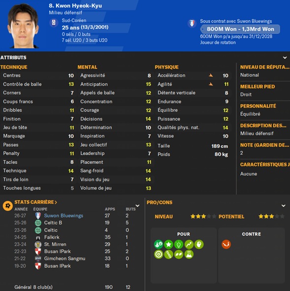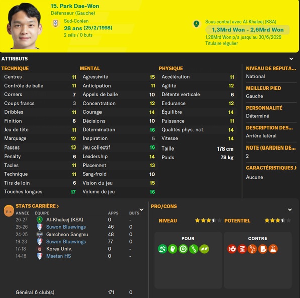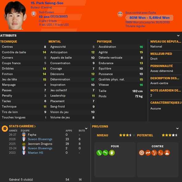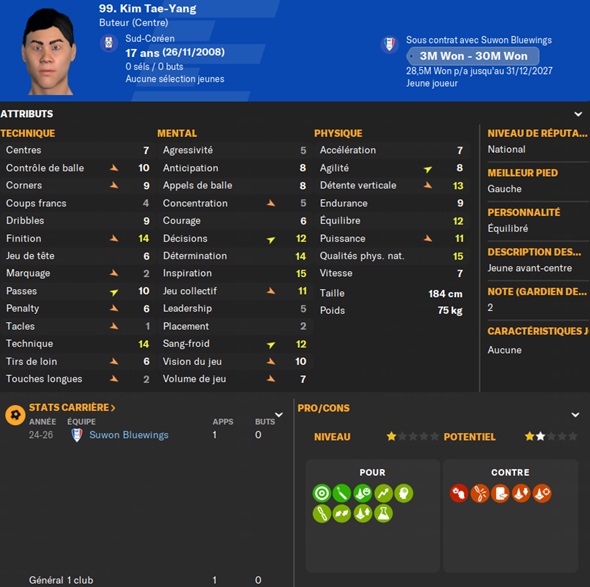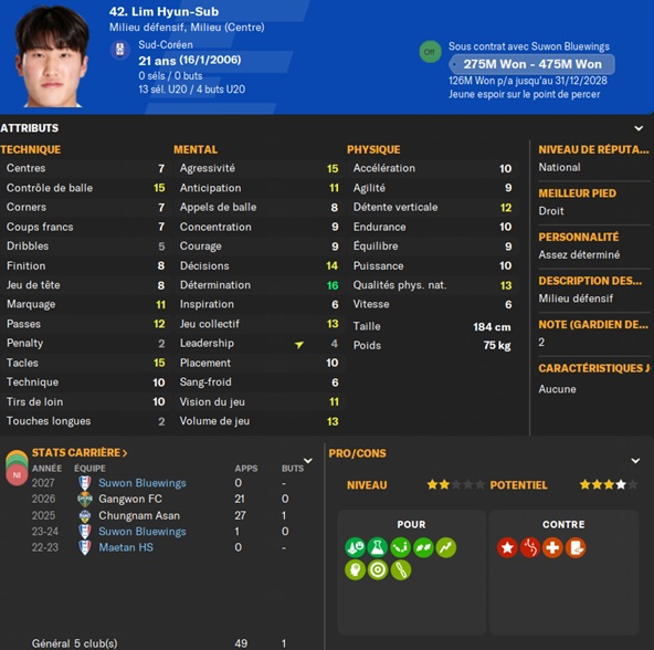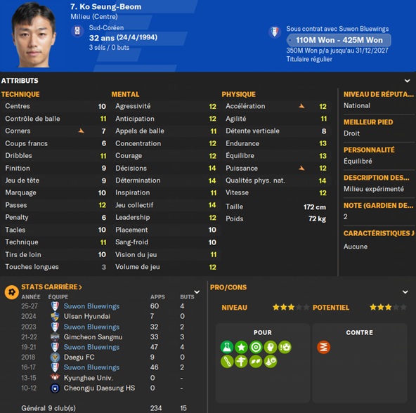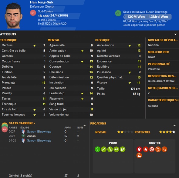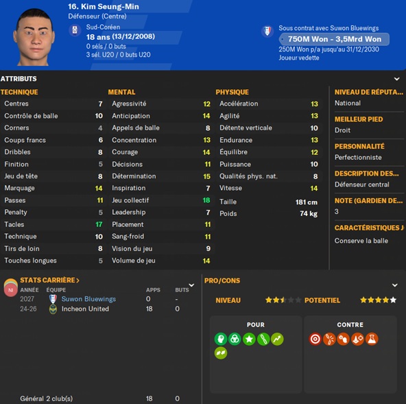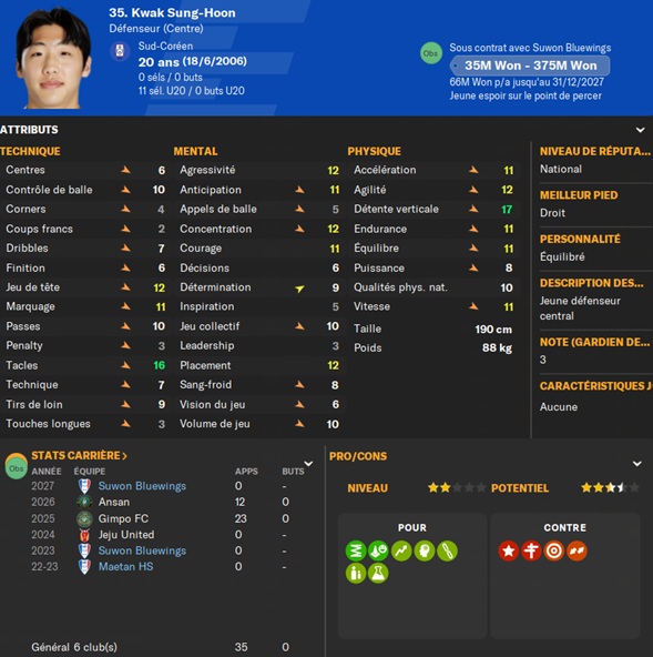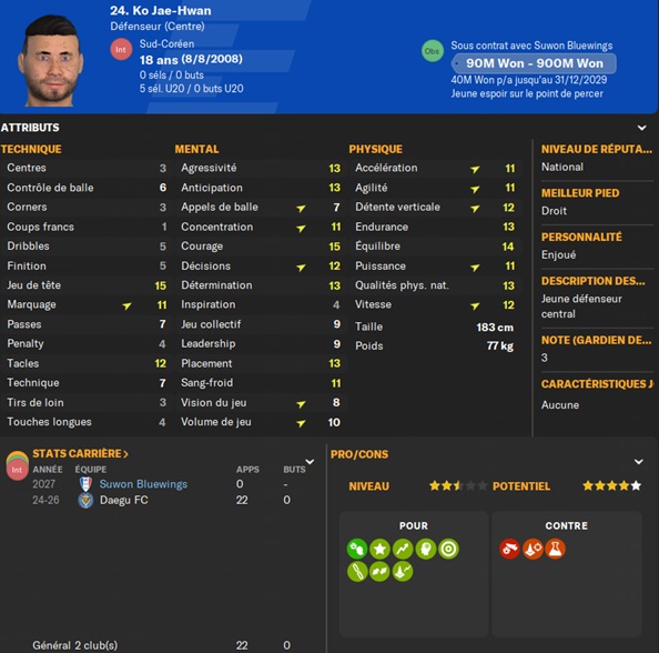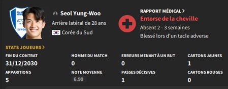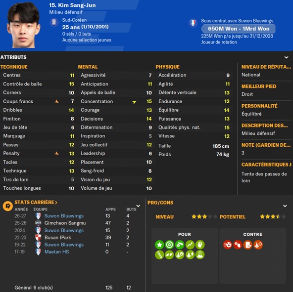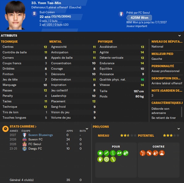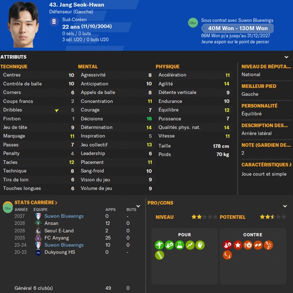 Notre rival du FC Seoul a placĂ© un arriĂšre gauche intĂ©ressant sur la liste des prĂȘts. Je lâapproche et lâobtiens avec une option dâachat de â©425M.