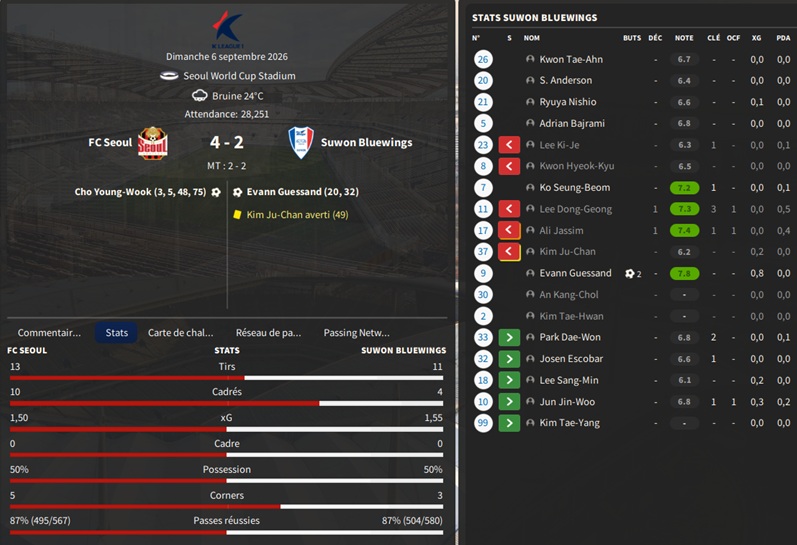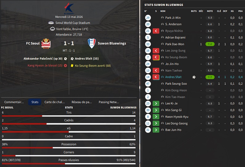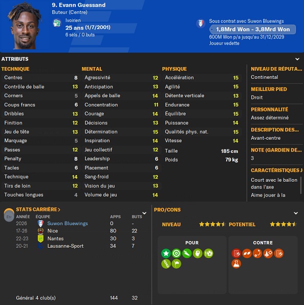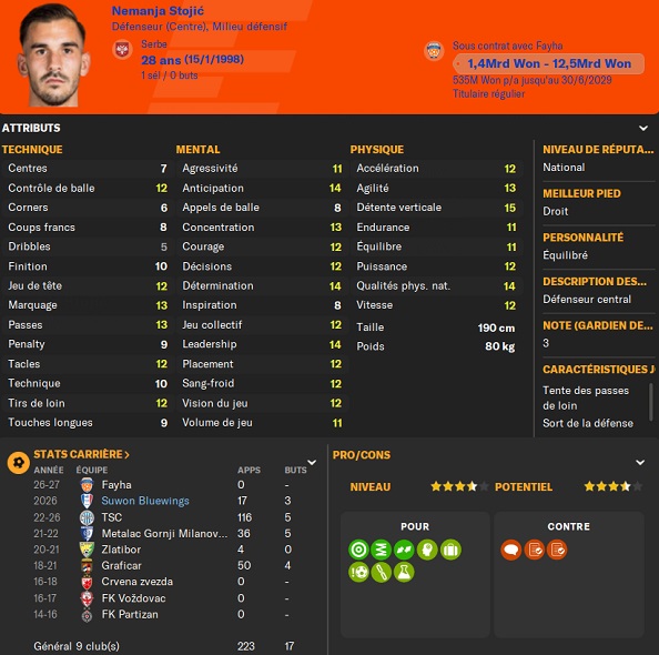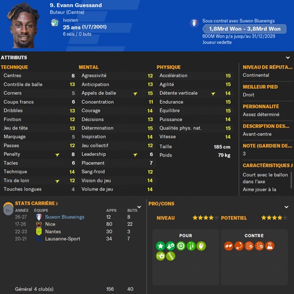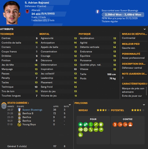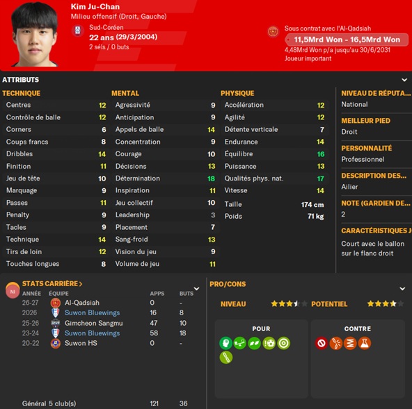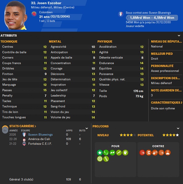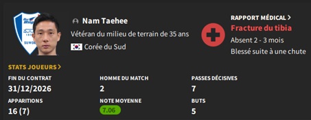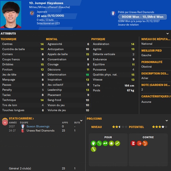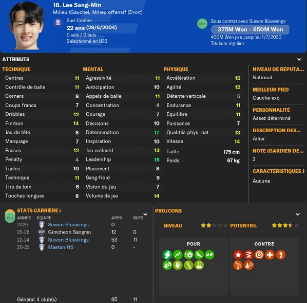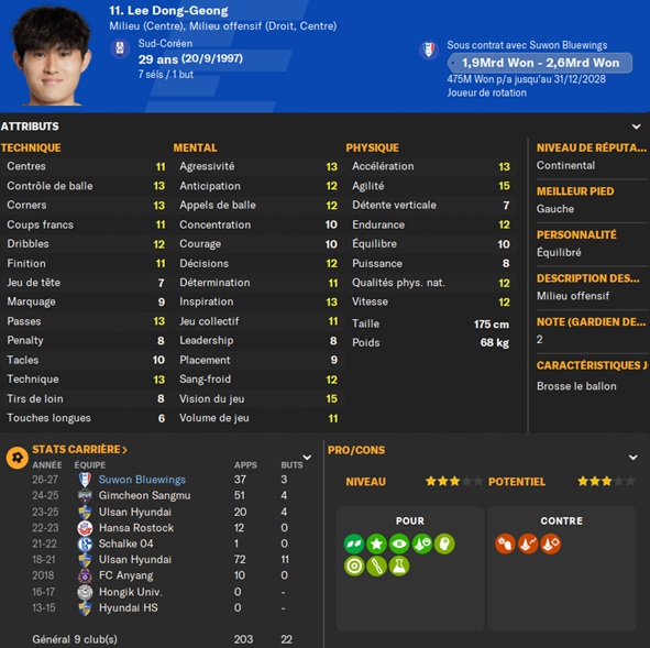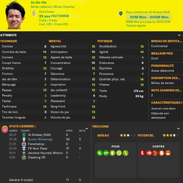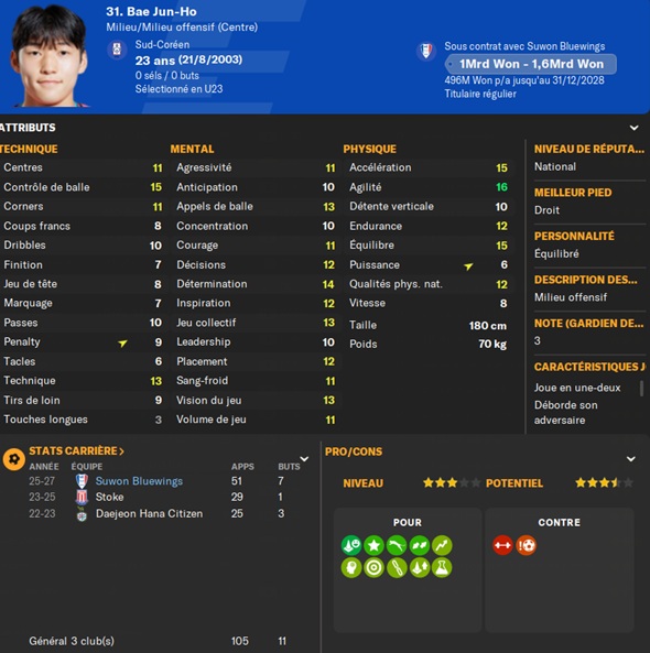Notre rival du FC Seoul a placĂ© un arriĂšre gauche intĂ©ressant sur la liste des prĂȘts. Je lâapproche et lâobtiens avec une option dâachat de â©425M.