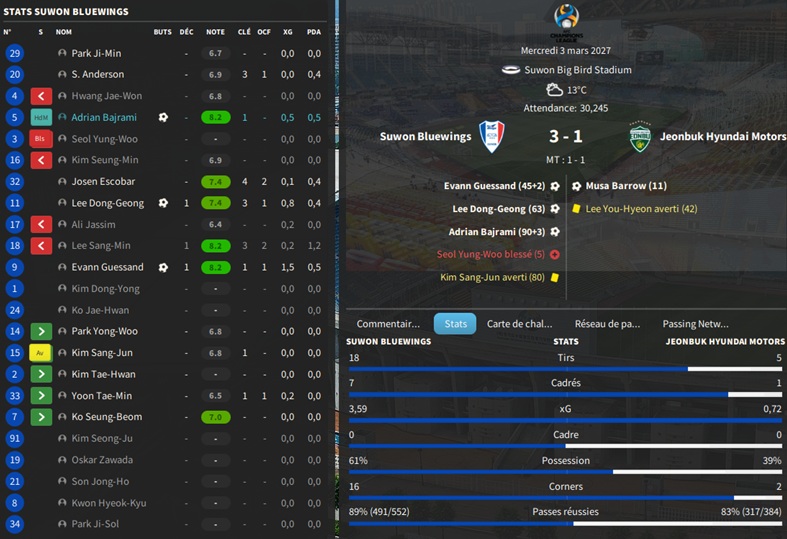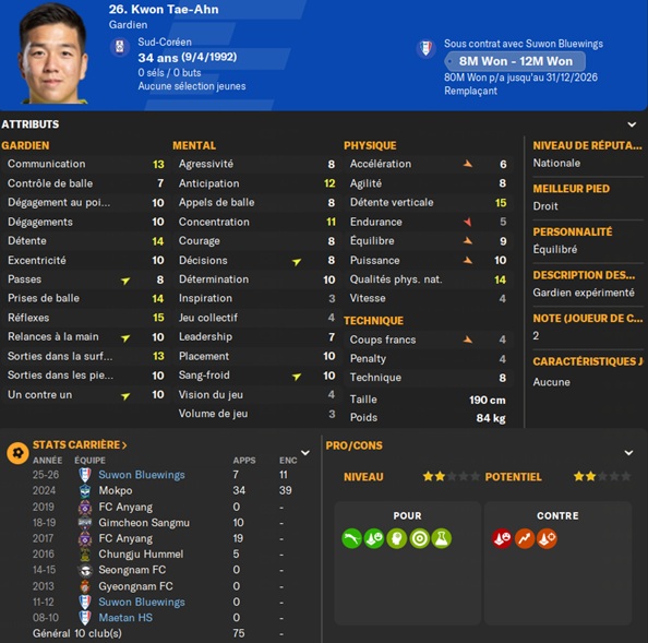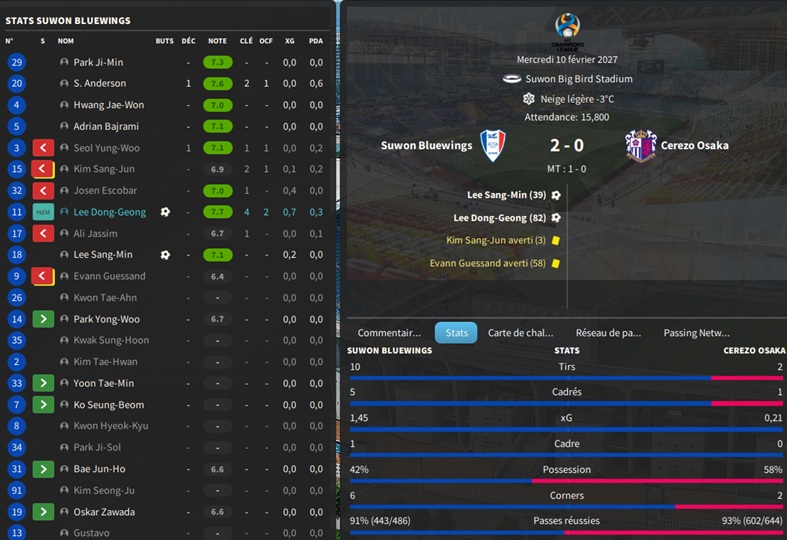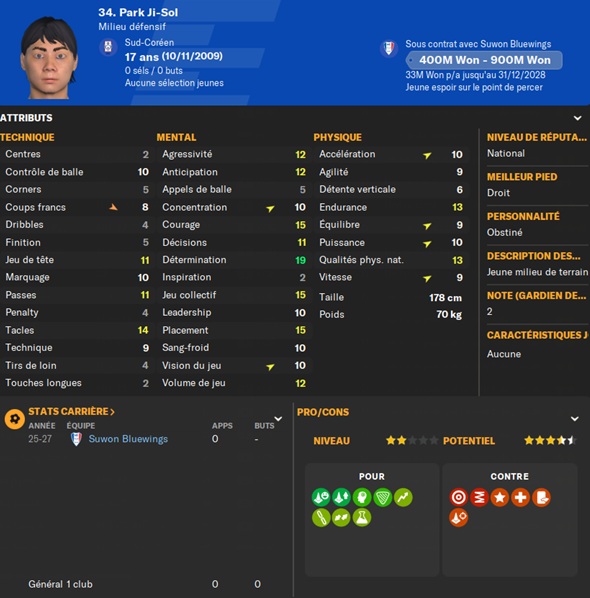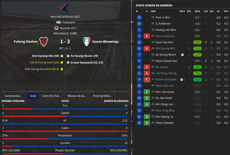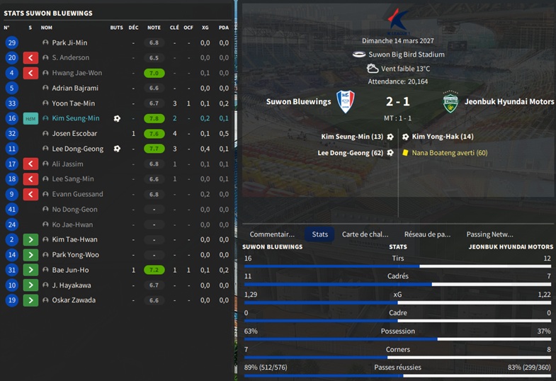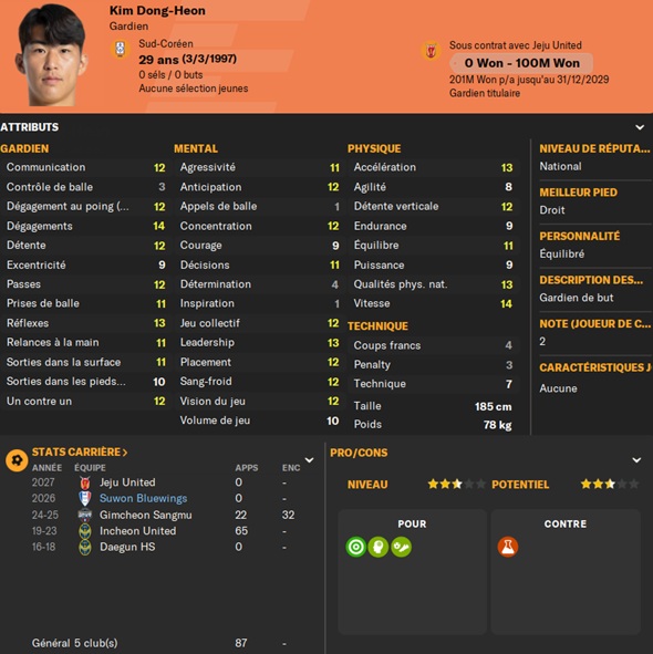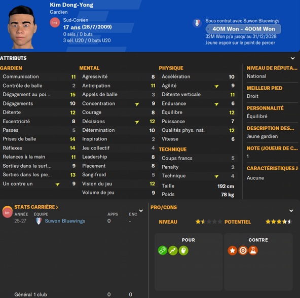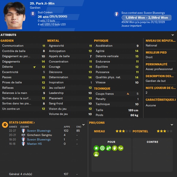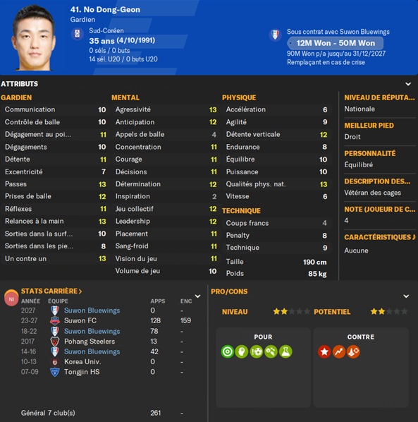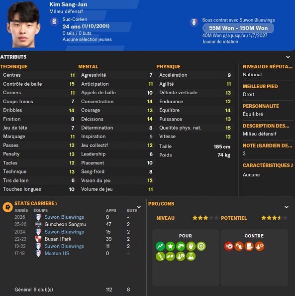 Dernier gros transfert avant le dĂ©but de saison : on recrute un jeune joueur du club dâIncheon : Kim Seung-Min. Ce sera notre second U22 de lâĂ©quipe. Incheon nâĂ©tant pas un tĂ©nor (ils se sont maintenus en K-League 1 aprĂšs ĂȘtre passĂ©s par les barrages), câest difficile pour un joueur de refuser un contrat chez le champion. Ăvidemment, Incheon a demandĂ© lâextra-sauce que nous avons pu payer en pĂ©trodollars.