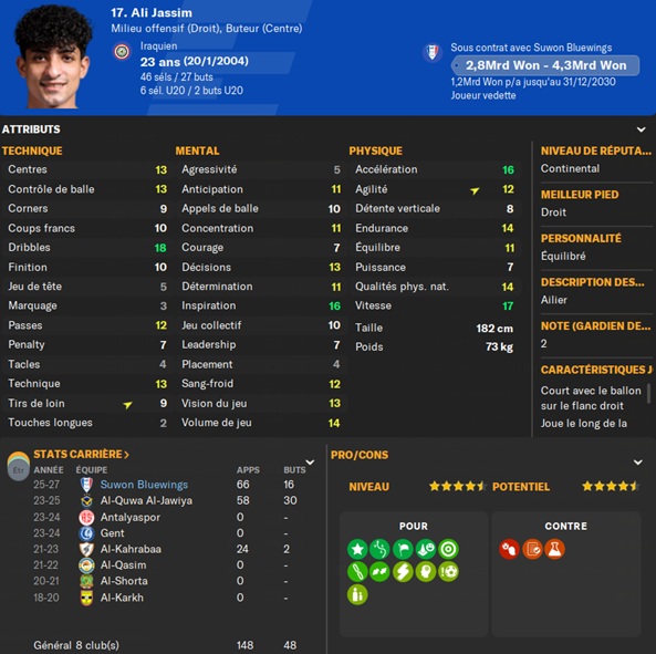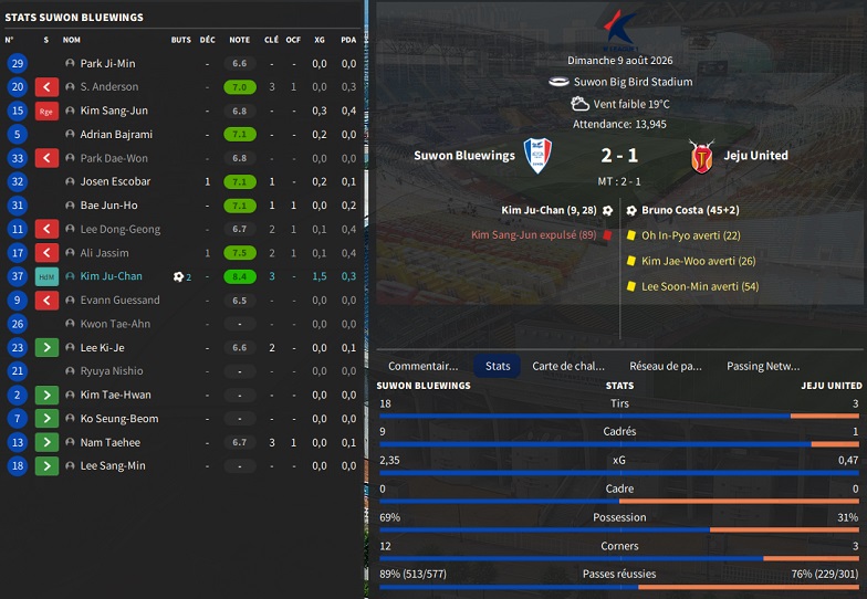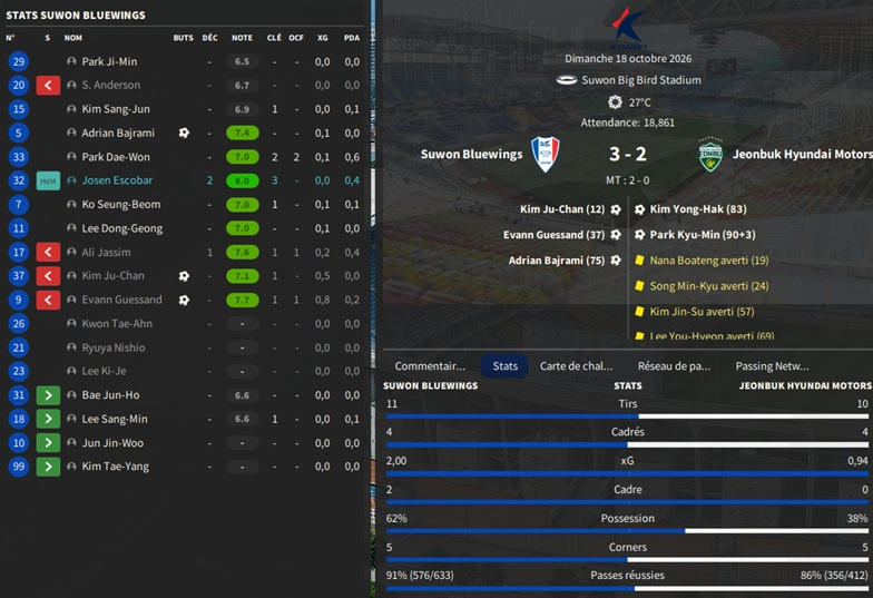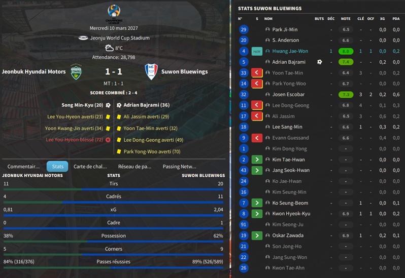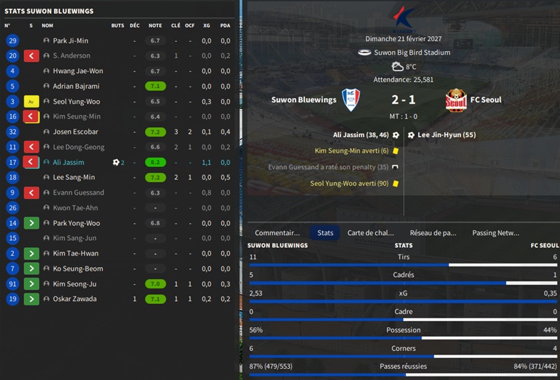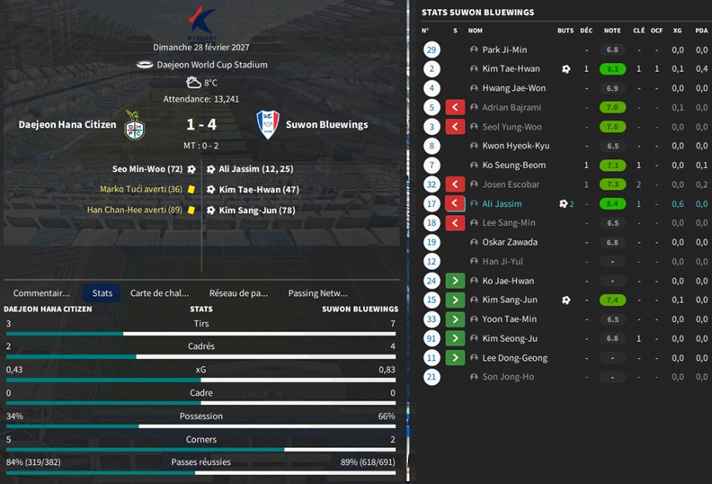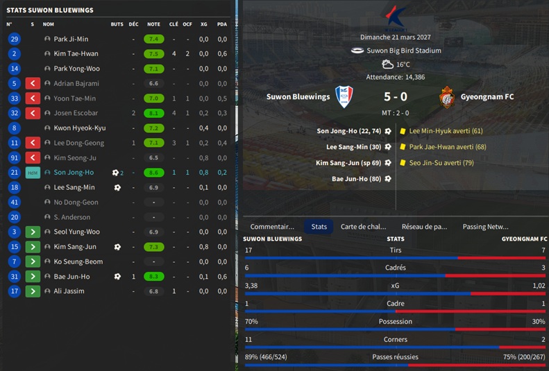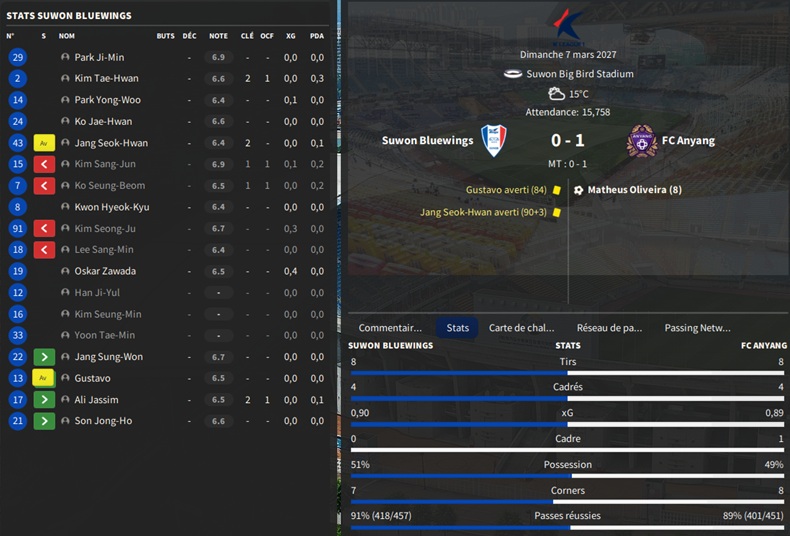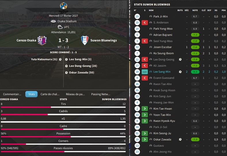 Dernier gros transfert avant le dĂ©but de saison : on recrute un jeune joueur du club dâIncheon : Kim Seung-Min. Ce sera notre second U22 de lâĂ©quipe. Incheon nâĂ©tant pas un tĂ©nor (ils se sont maintenus en K-League 1 aprĂšs ĂȘtre passĂ©s par les barrages), câest difficile pour un joueur de refuser un contrat chez le champion. Ăvidemment, Incheon a demandĂ© lâextra-sauce que nous avons pu payer en pĂ©trodollars.
