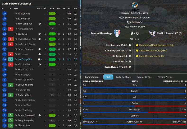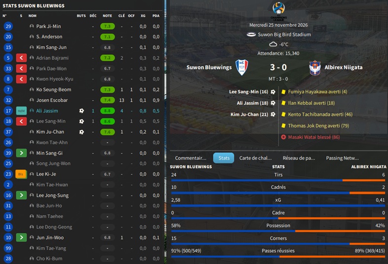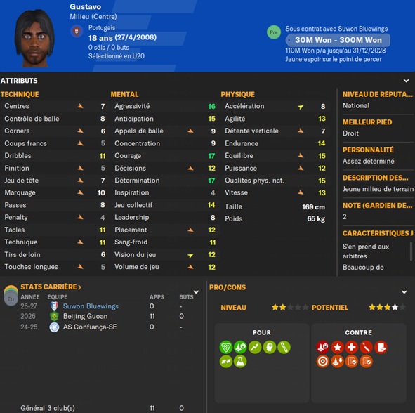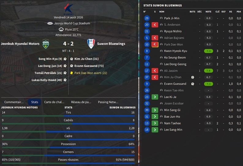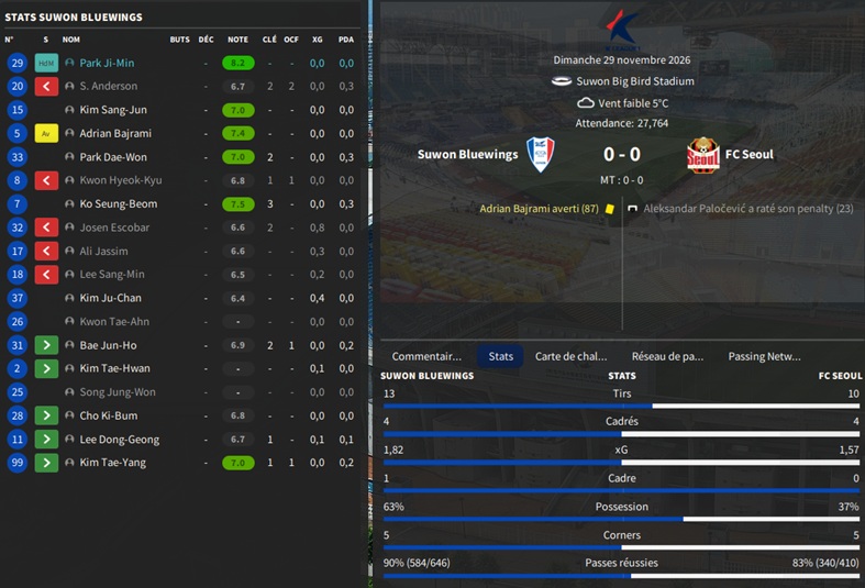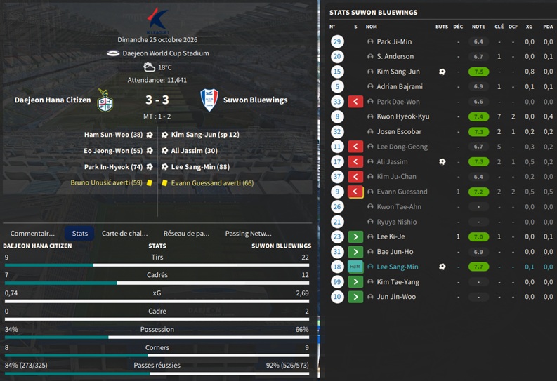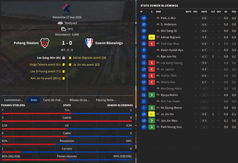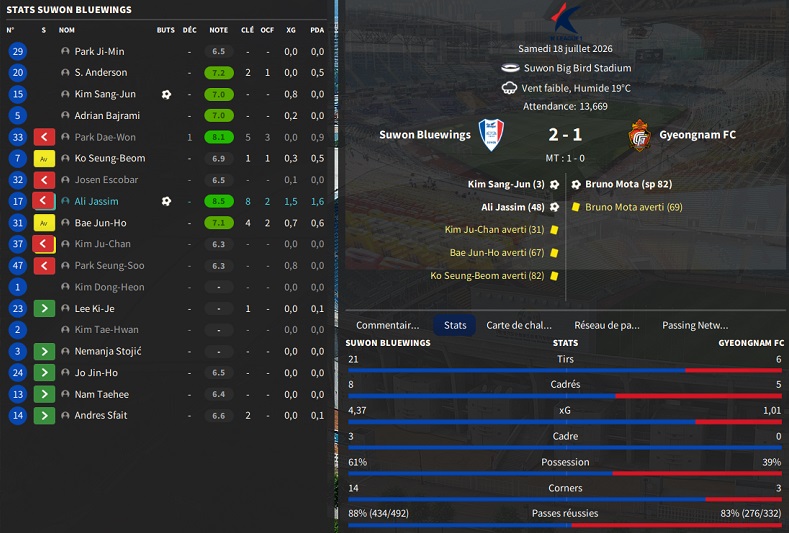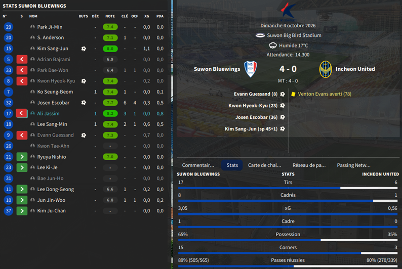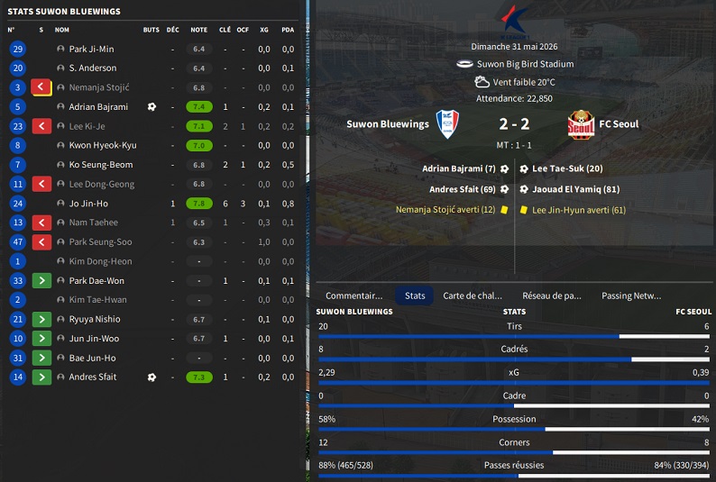 Dernier gros transfert avant le dĂ©but de saison : on recrute un jeune joueur du club dâIncheon : Kim Seung-Min. Ce sera notre second U22 de lâĂ©quipe. Incheon nâĂ©tant pas un tĂ©nor (ils se sont maintenus en K-League 1 aprĂšs ĂȘtre passĂ©s par les barrages), câest difficile pour un joueur de refuser un contrat chez le champion. Ăvidemment, Incheon a demandĂ© lâextra-sauce que nous avons pu payer en pĂ©trodollars.