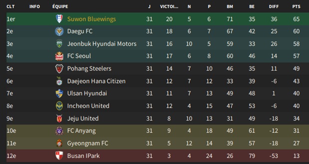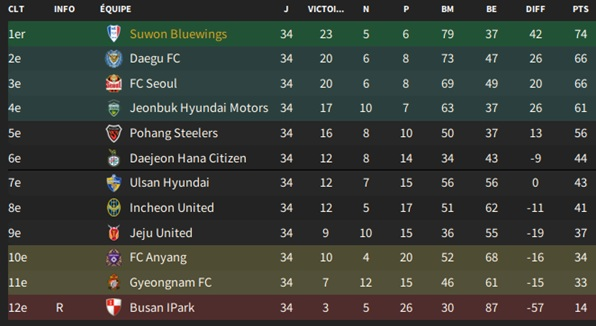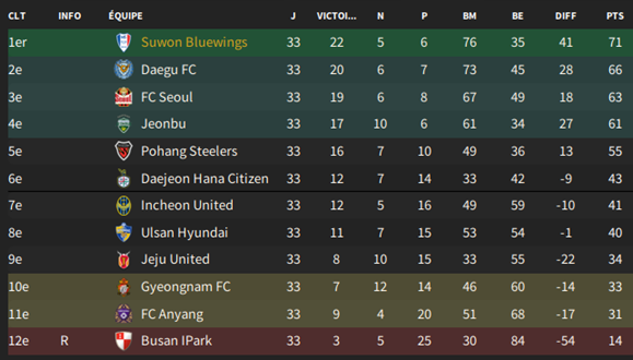 On mise sur la jeunesse dans les buts puisque nos vĂ©tĂ©rans de lâĂ©quipe rĂ©serve refusent de prolonger ; seul kim Dong-Yong est rescapĂ©s derriĂšre, le milieu reste intact et trois nouveaux Ă©galement devant. Les flancs de lâattaque sont occupĂ©s par des jeunes pour le moment, dont un issu de notre centre de formation : Kim Seong-Ju.