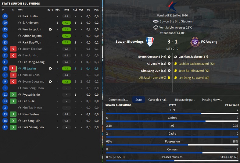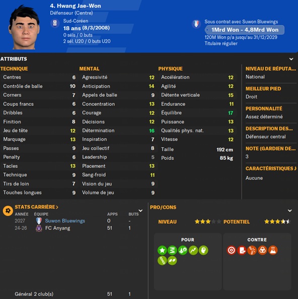 Le FC Anyang semble possĂ©der un bon centre de formation mais vĂ©gĂšte dans le centre/bas du tableau, aux portes des barrages lâan dernier. MĂ©content, Ă la recherche dâun club plus en adĂ©quation avec ses ambitions, Hwang Jae-Won voulait partir. Jâapproche Anyang, une somme de â©2Mrd ferait leur affaire, offre que jâaccepte.