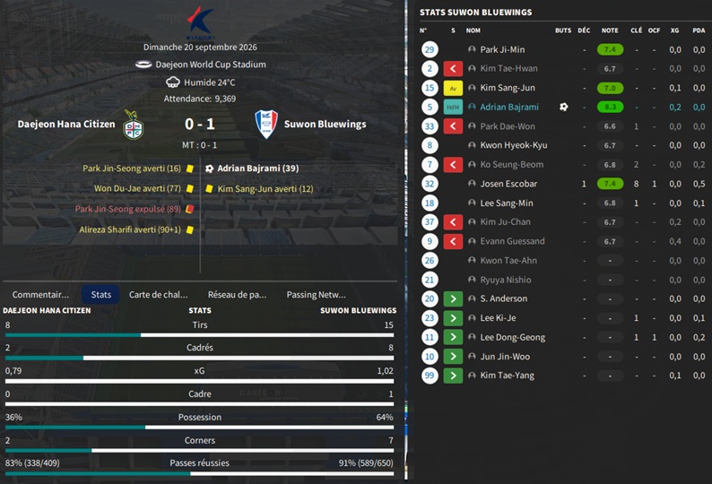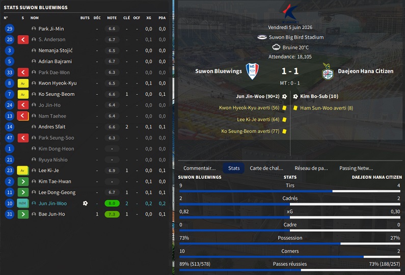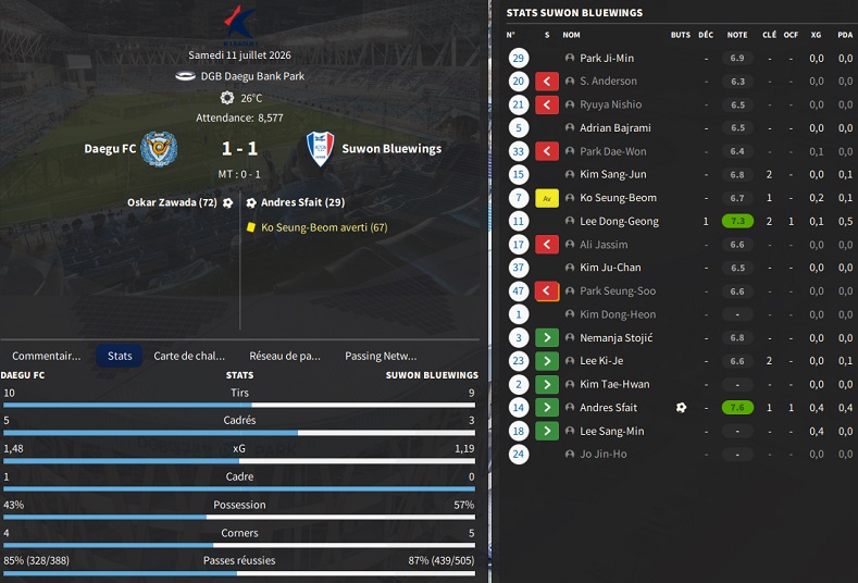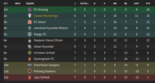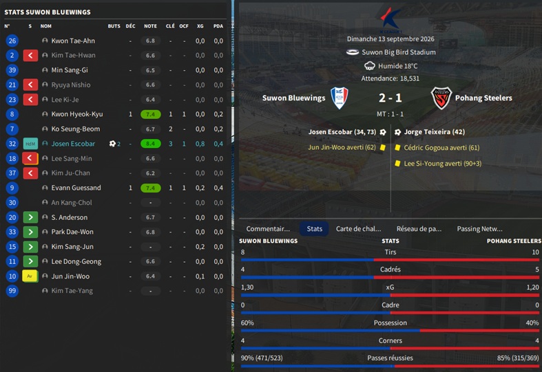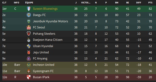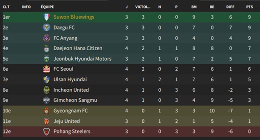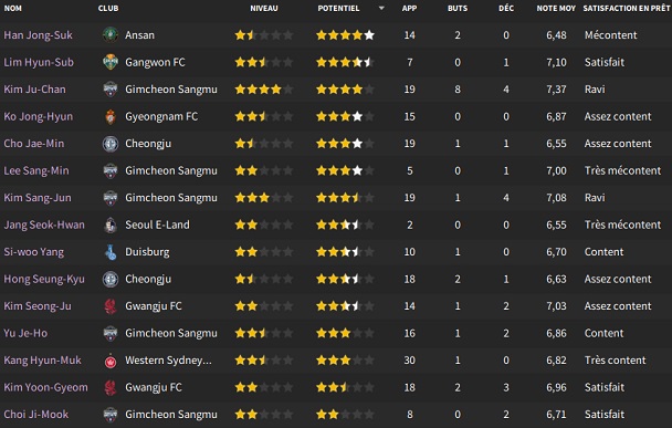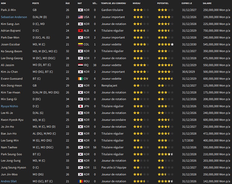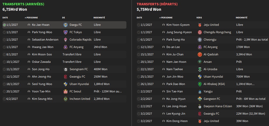 Petit changement lors des transferts : vu la difficultĂ© pour recruter local, je mâautorise Ă recruter des joueurs des autres Ă©quipes de K-League 1, mais au prix exigĂ© par lâĂ©quipe adverse aprĂšs avoir introduit une demande de renseignement.