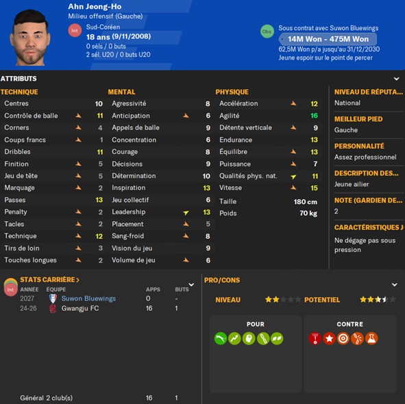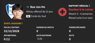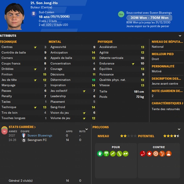 Nous levons la clause libĂ©ratoire dâun autre jeune espoir corĂ©en : Son Jong-So. Cela vaut la peine dâĂ©cumer un peu les Ă©quipes de K-League 2, certaines ont de bonnes infrastructures de formation.