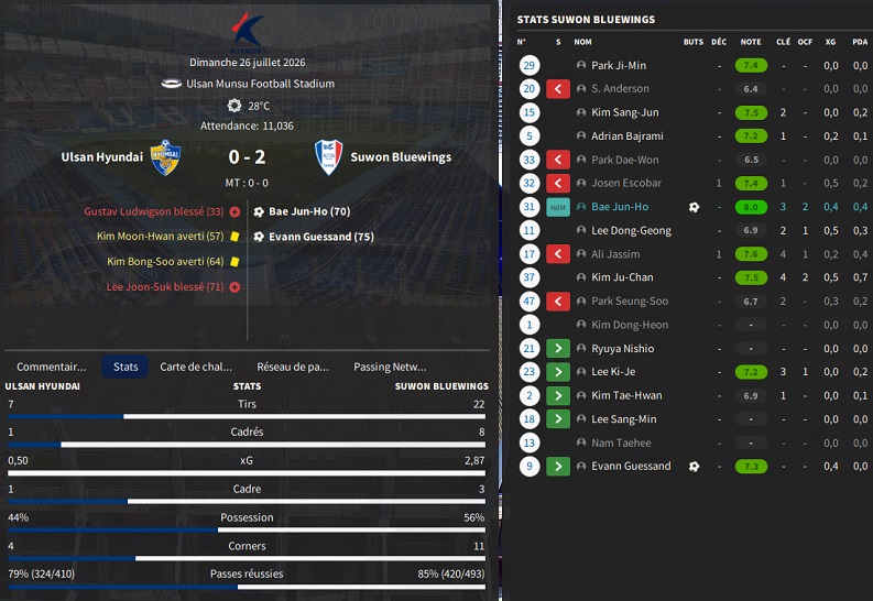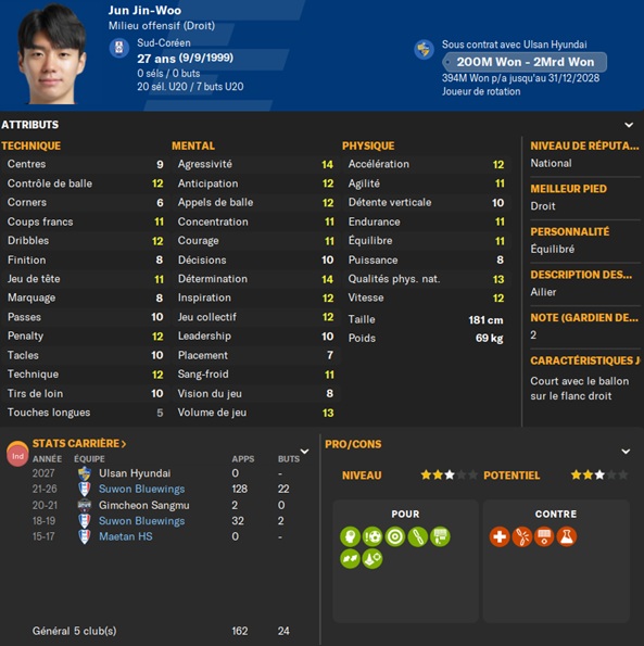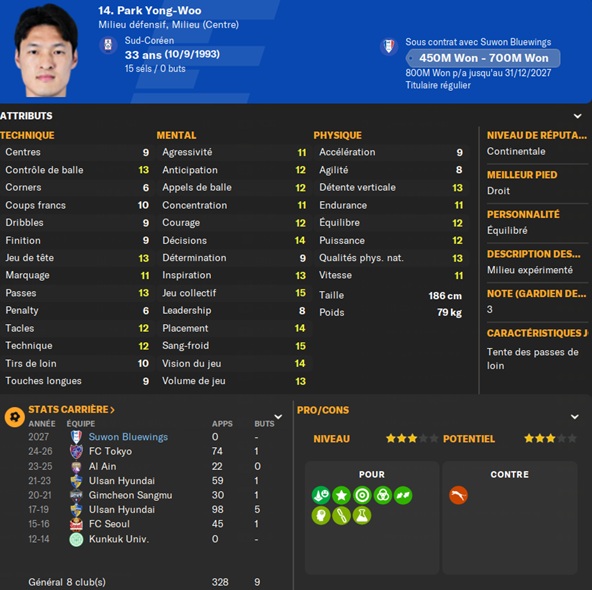 AprĂšs le dĂ©part de notre vedette, il fallait bouger vite. Je suivais un joueur polyvalent, capable de jouer sur les deux flancs, aussi bien en dĂ©fense quâen attaque: Seol Yung-Woo. Jâapproche Ulsan qui rĂ©clame gros prix : â©1,8Mrd. Pas le choix, je fonce, dâautant plus quâun autre dĂ©part se profile Ă lâhorizon sur le flanc gauche.