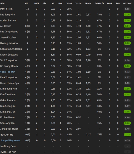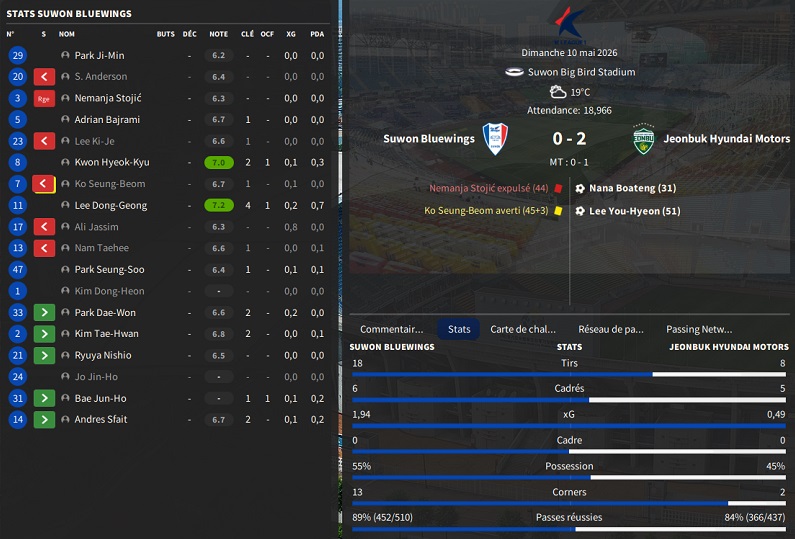 Nouveau dĂ©part, encore sur les flancs : notre arriĂšre gauche Park Dae-Won rejoint lui aussi lâArabie saoudite. Ses performances en match nâont jamais Ă©tĂ© Ă la hauteur de mes attentes, terminant dâailleurs lâexceptionnelle saison 2026 avec une petite moyenne de 6.84, soit la moins bonne moyenne du Onze de base.