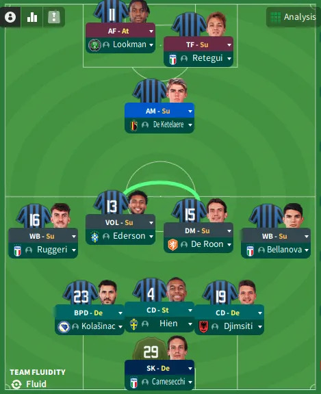 La précision technique et l’intelligence tactique sont essentielles pour les milieux de terrain de Gasperini. Ederson évolue au poste de « Segundo Volante » et met à profit son rythme de travail et son endurance pour apporter une contribution dynamique. Marten de Roon, grâce à sa vision du jeu et à ses passes exceptionnelles, orchestre le jeu en tant que « milieu défensif » chargé du soutien. Les deux joueurs ont pour consigne de privilégier les passes courtes, de conserver la possession du ballon et d’imposer le rythme.
