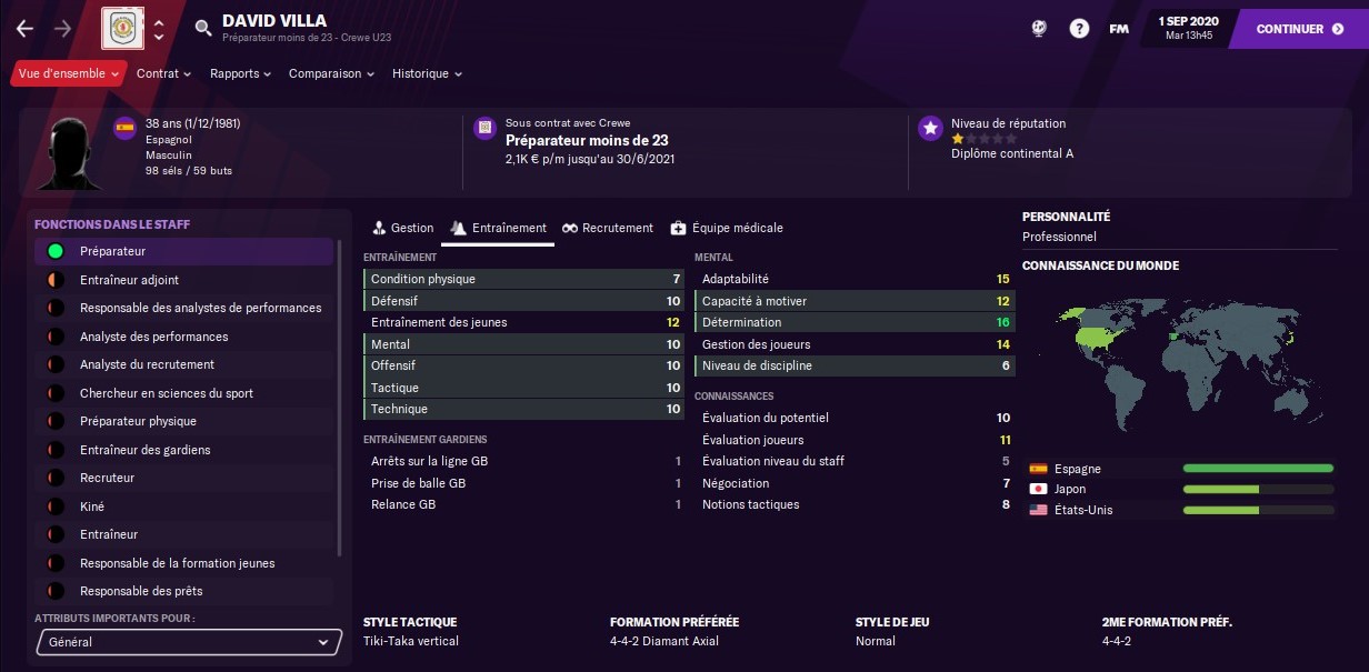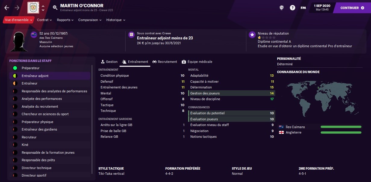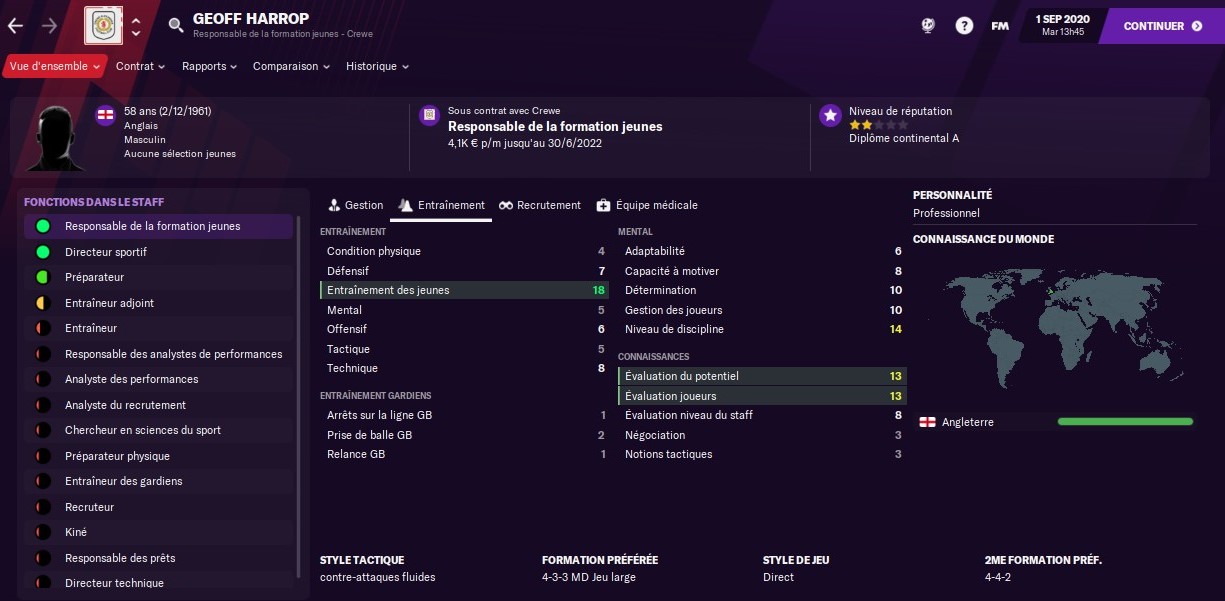 Jâai dâabord trouvĂ© la bonne personne au poste de responsable de la formation. Anglais, sĂ©rieux, trĂšs calĂ© sur la progression des jeunes, et surtout un partisan du 4-3-3 : Geoff Harrop coche littĂ©ralement toutes les cases de mes recherches Ă ce poste ! Sa personnalitĂ© est un Ă©norme plus. Jâai dĂ©jĂ hĂąte de voir les futures gĂ©nĂ©rations de pĂ©pites formĂ©es par ses soins.