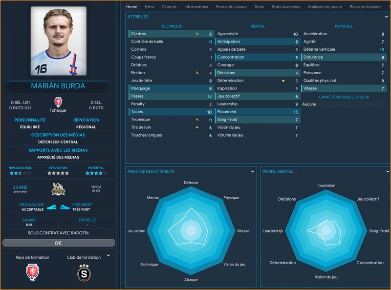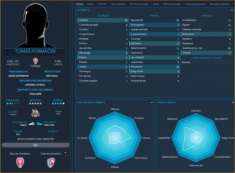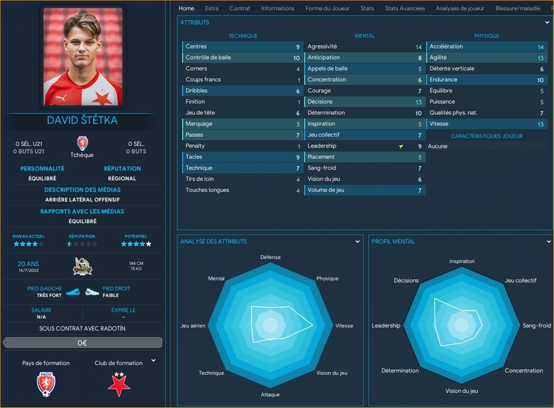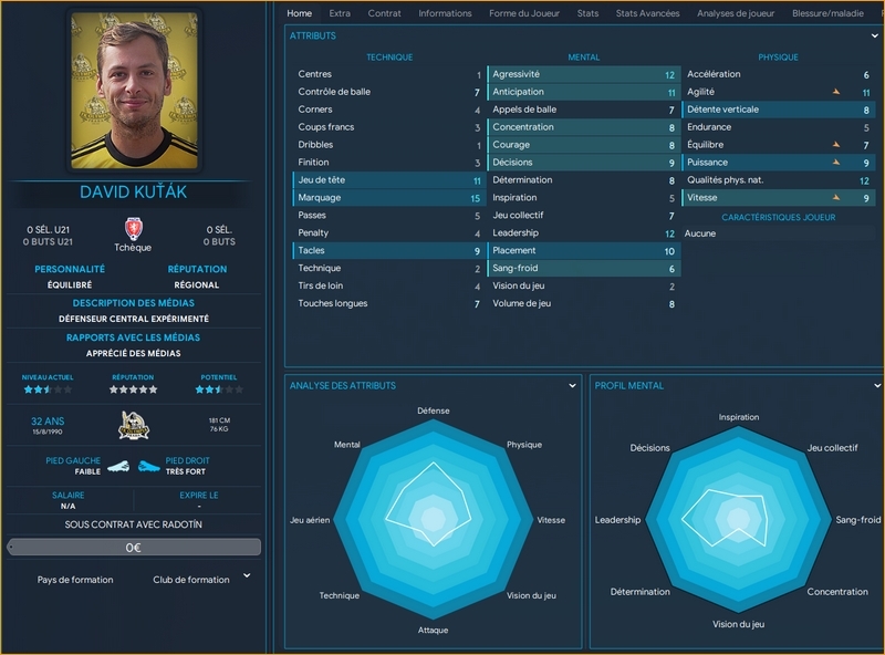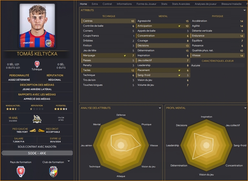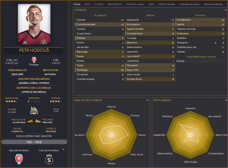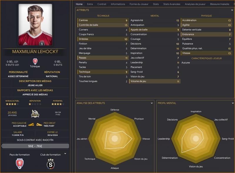 Second joueur à arrivé au club et formé par le Sparta, Lehocky arrive un peu tardivement. N’ayant qu’une solution au club au poste de MOD avec Kouril, j’étais obligé de former des joueurs latéraux gauche ou ailier gauche à ce poste. Mais, Lehocky semble posséder des capacités fort intéressantes et il signe au club pour prendre la place de titulaire.